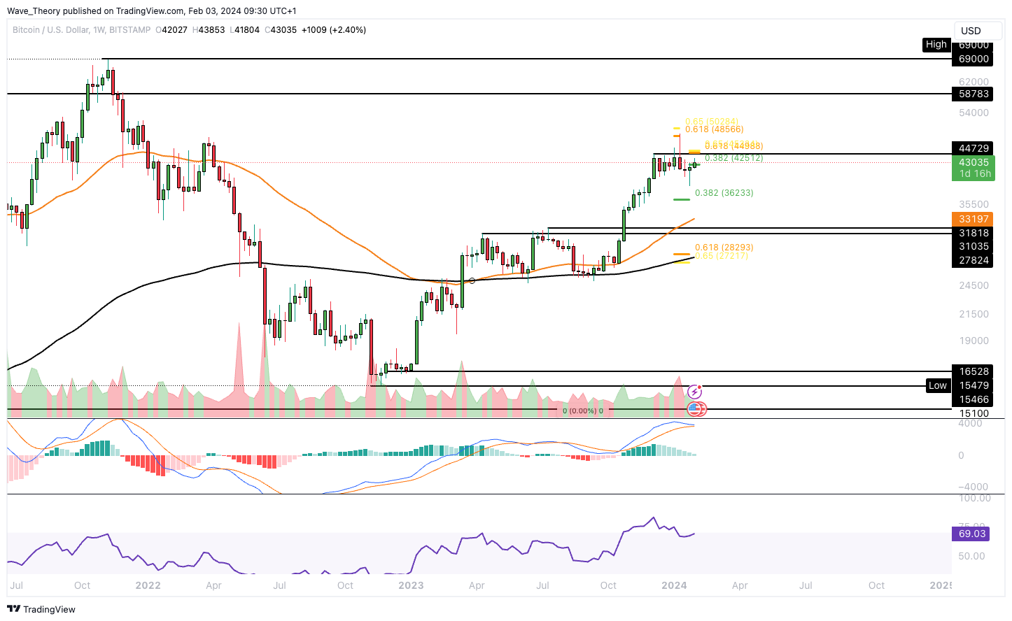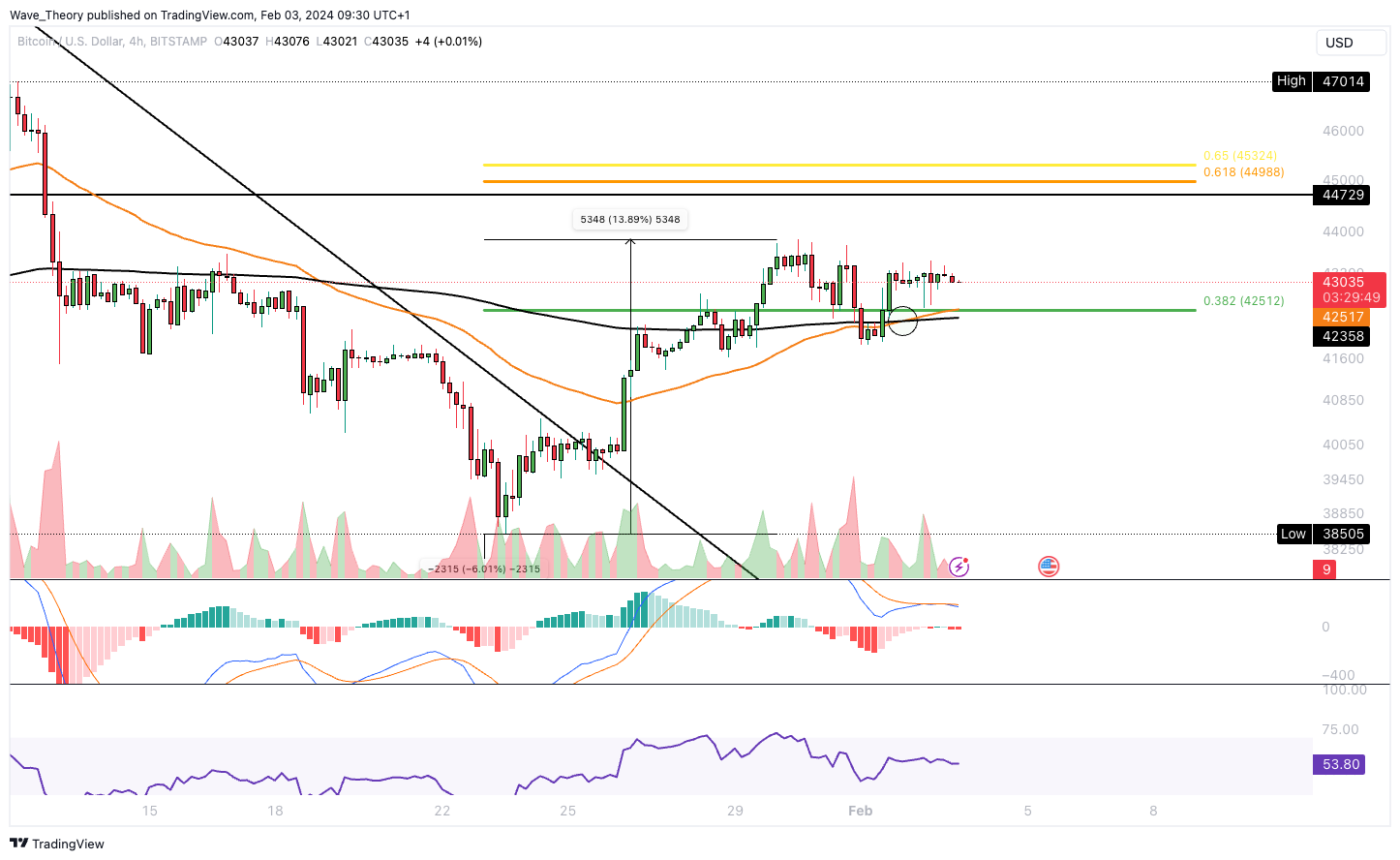 Auch den 0,382 Fib Widerstand bei rund 42.500 USD konnte BTC hinter sich lassen. Damit wartet jetzt bei rund 45.000 USD der entscheidende Fibonacci Widerstand.