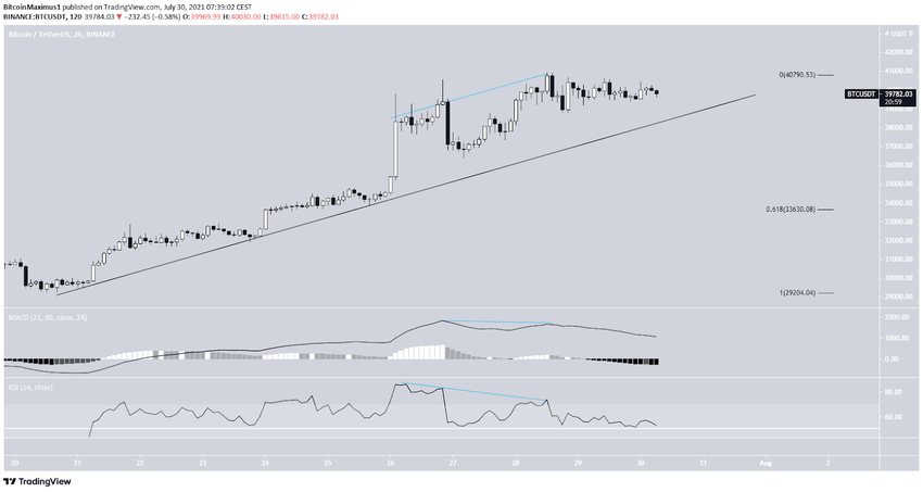 Der 2-Stunden-Bitcoin-Chart liefert uns verschiedene Anhaltspunkte. Zuerst gab es sowohl auf dem MACD als auch auf dem RSI einige bärische Divergenzen zu sehen. Danach gab es einen Drop, der allerdings nicht besonders stark war. Außerdem gibt es seit dem Tiefpunkt vom 20. Juli 2021 eine aufsteigende Support-Linie, der der Bitcoin Kurs immer noch folgt. Solange diese Linie intakt ist, können wir davon ausgehen, dass der kurzfristige Trend bullisch ist. Sollte der BTC Kurs unter diese ausbrechen, dann findet der BTC Kurs bei 33.600 USD, dem 0.618-Fib-Retracement-Level Support.