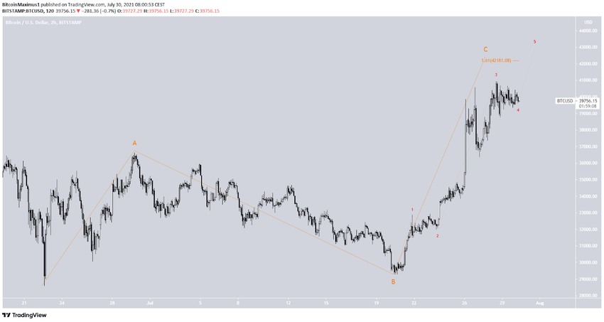 Der Bitcoin Kurs befindet sich wohl immer noch in der C-Welle einer A-B-C-Korrekturstruktur. Das wahrscheinlichste Preisziel für den Hochpunkt der C-Welle liegt bei 42.181. Die A und die C-Welle hätten dann ein Verhältnis von 1:1.61. Die Teilwellenzählung ist in Rot eingezeichnet. Der BTC Kurs befindet sich wohl gerade in der vierten Teilwelle.