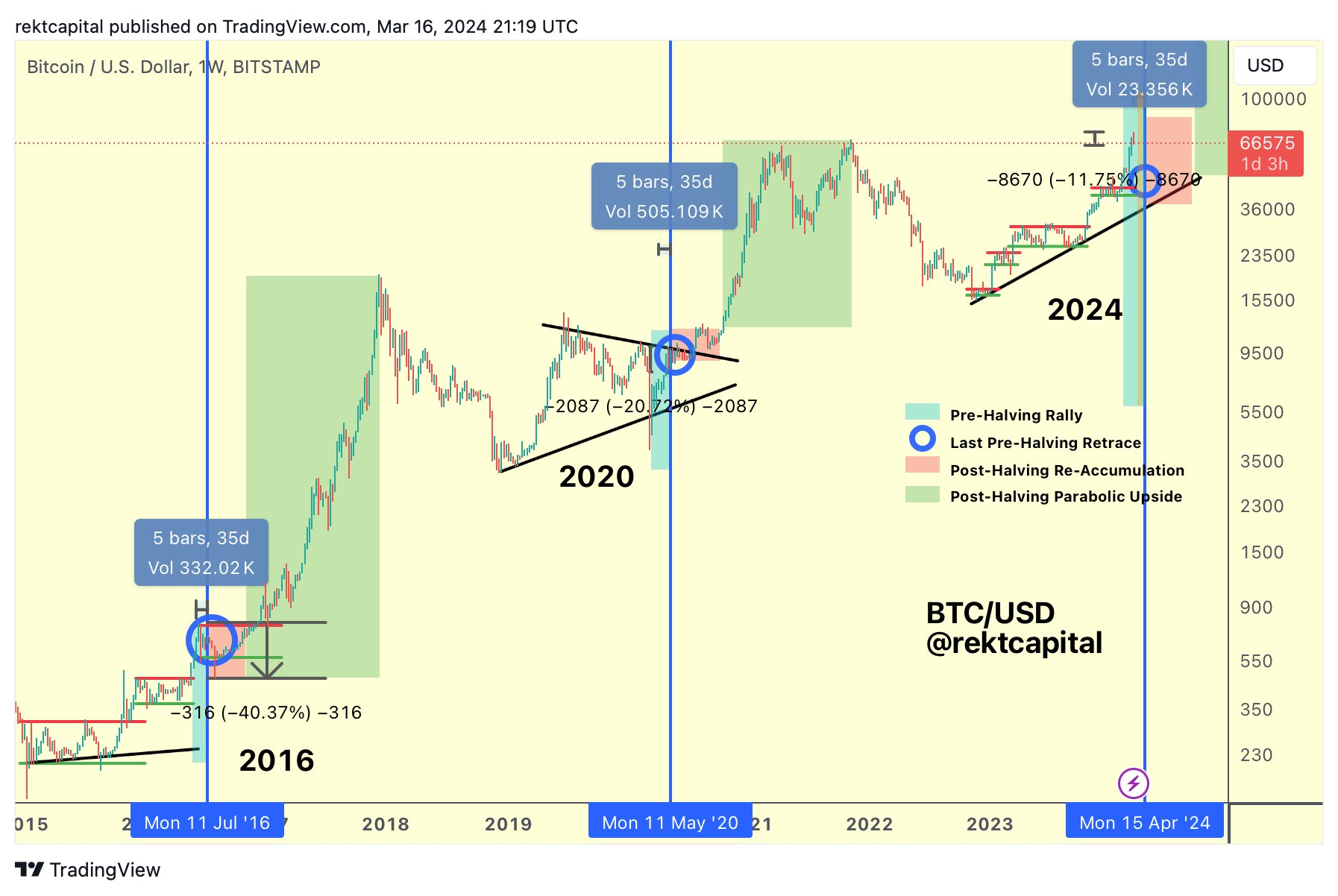 Laut Rekt Capital bleibt der aktuelle Bullenmarkt trotz der Einführung von börsengehandelten Bitcoin-Spot-Fonds (ETFs) anfällig für einen Retrace vor dem Halving. Diese Rücksetzer treten typischerweise 14-28 Tage vor dem Bitcoin Halving auf.