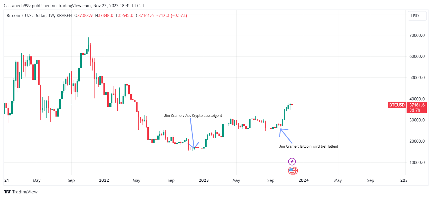 So erklärte Cramer beispielsweise Anfang Oktober 2023, als der Bitcoin Kurs bei rund 25.000 US-Dollar (dem letzten Tiefpunkt!) lag: