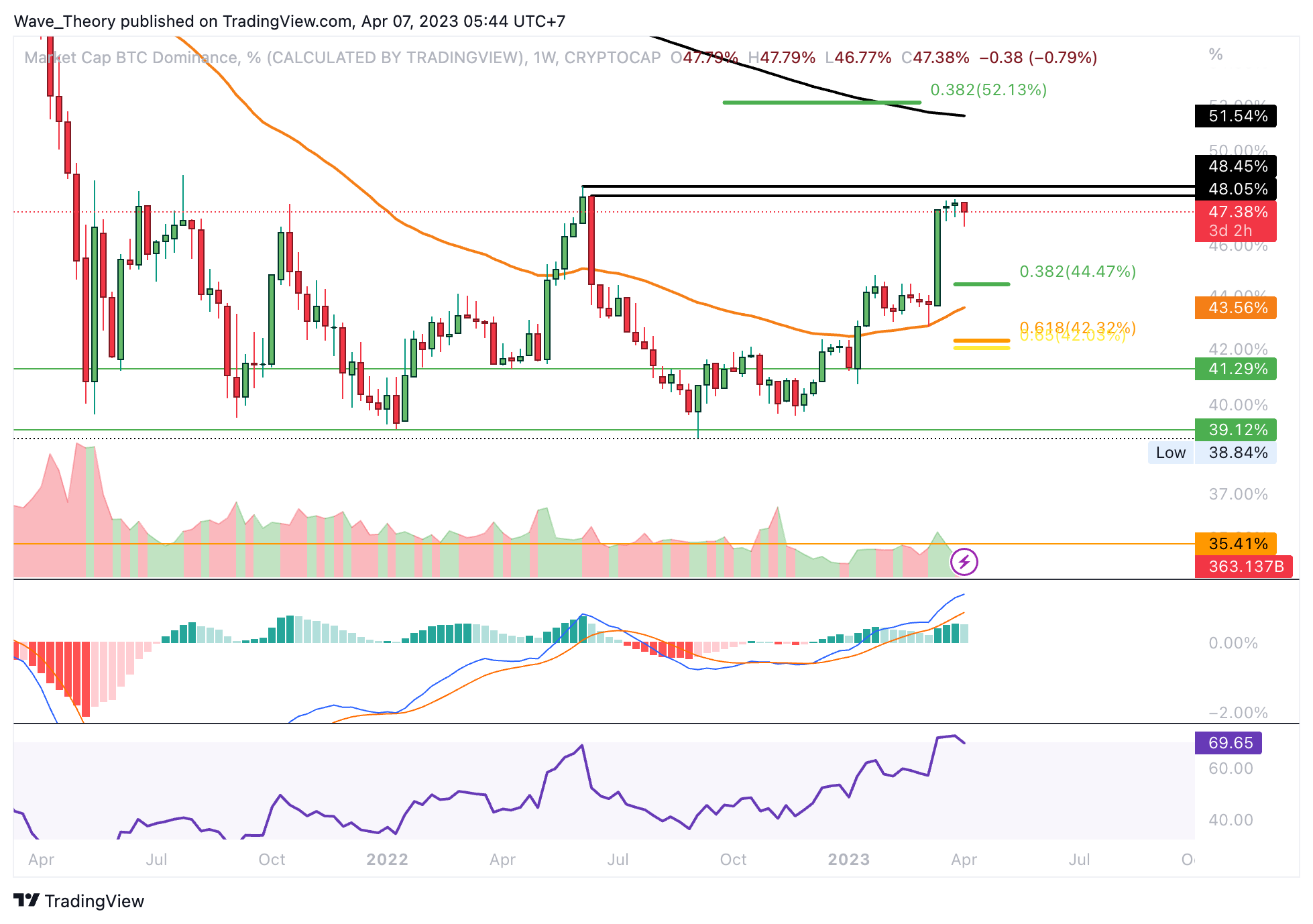 Auch der Kryptomarkt hat sich in den letzten drei Wochen nicht wirklich höher bewegt, sondern stagniert bei rund 1,14 Billionen USD. Nichtsdestoweniger hält sich der Kryptomarkt über der 50-Wochen-EMA Unterstützung bei rund 1,1 Billionen USD. Sofern diese Unterstützung hält, könnte die Marktkapitalisierung des Kryptomarktes immer noch das nächste Fib Niveau bei rund 1,27 Billionen USD anvisieren.
