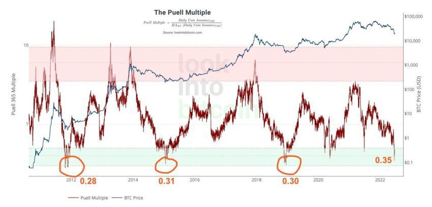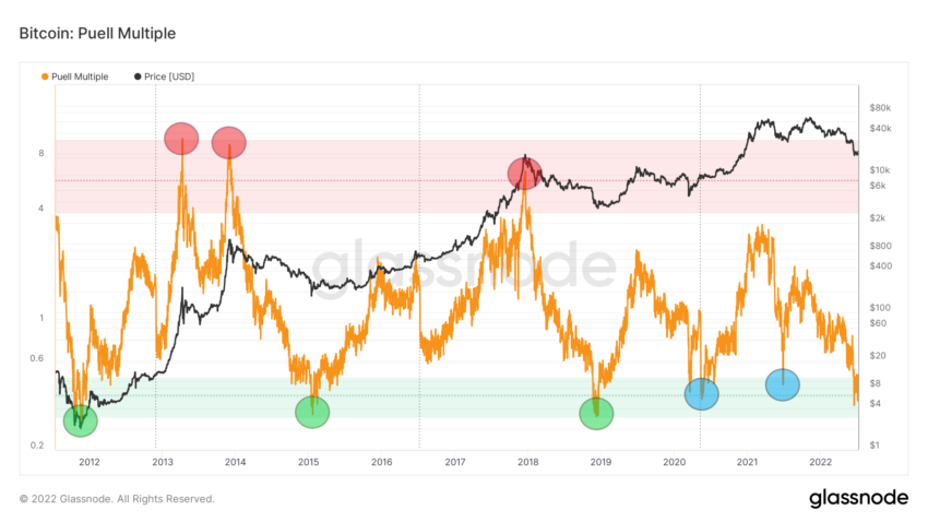 Der Analyst @TheChainRN teilte vor kurzem auf Twitter seine Interpretation des Puell Multiple Indikators kam zu einer ähnlichen Schlussfolgerung und. Er erklärte, dass der Indikator in vorherigen Bärenmärkten Werte zwischen 0.28- und 0.31 erreichte. Darum argumentiert er, dass wir noch mit weiteren Kursrückgängen rechnen müssen, da sich der Indikator gerade bei 0.35 befindet. Der Indikator wird also möglicherweise nochmal auf historische Tiefstände fallen, ehe der Bitcoin Kurs dann den Boden geformt hat.