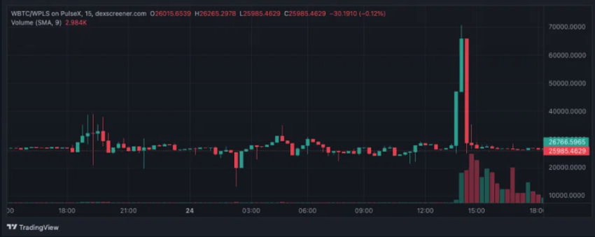 Die hohe Kursvolatilität von wrapped Bitcoin zeigt die Schwächen von Pulsechain auf – schließlich stieg das Volumen scheinbar ohne Grund an, als der Preis so stark anstieg.