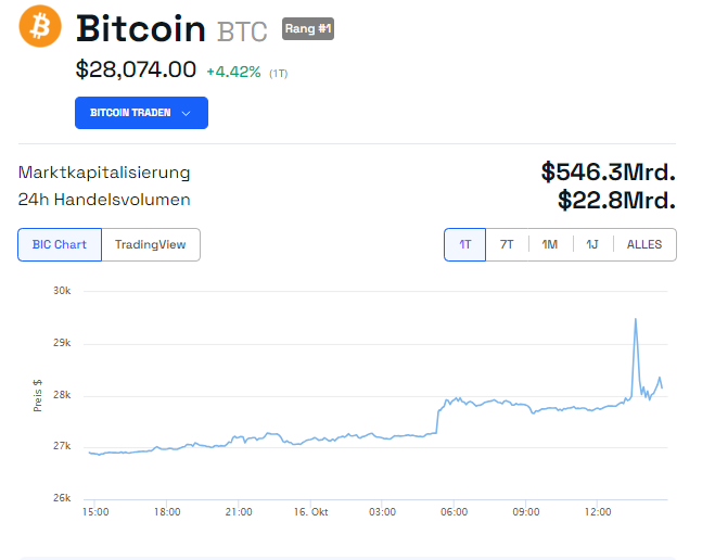 Es dauerte jedoch nicht lange, bis die Marktteilnehmer realisierten, dass es sich um Fake-News handelt. Nur wenige Minuten nach dem sprunghaften Anstieg kehrte der Bitcoin Kurs wieder auf das Ausbruchsniveau von etwas unter 28.000 US-Dollar zurück. Zum Zeitpunkt der Veröffentlichung des Artikels bewegt sich der Preis etwas über 28.000 US-Dollar.