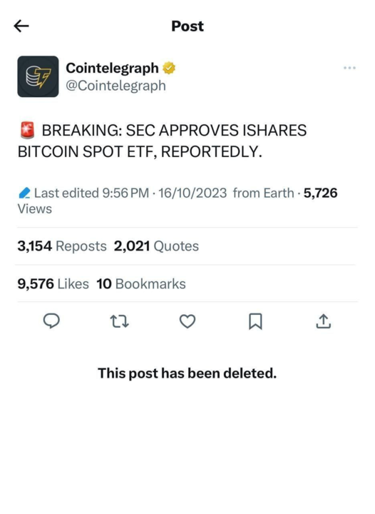 Am 16. Oktober gegen 15.30 veröffentlichte das Krypto-News-Magazin Cointelegraph einen Tweet über die Genehmigung des BlackRock Spot ETFs seitens der US-Behörde SEC. Etwa rund eine Stunde später löschte der Account jedoch den Tweet – und das wohl nicht ohne Grund.