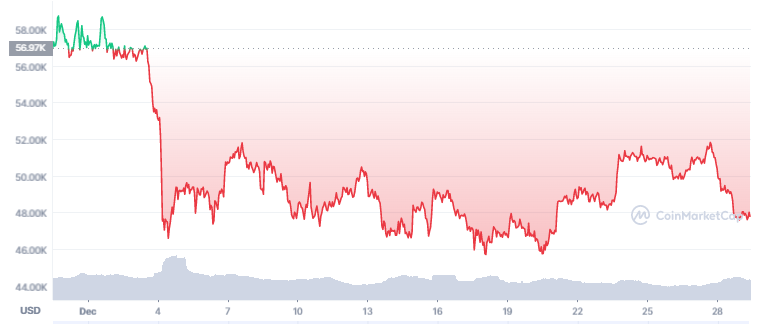 Anfang Dezember stand der Bitcoin Kurs bei knapp 56.000 US-Dollar, dann kam es zu einem Kursrutsch auf das Niveau bei etwa 47.000 US-Dollar. Seitdem bewegt sich der BTC Kurs in einer Seitwärtsbewegung. Nachdem der Bitcoin Kurs am 27. Dezember 2021 nochmal über 51.000 US-Dollar steigen konnte, rangiert die älteste Kryptowährung jetzt wieder um die 47.000 USD-Marke.