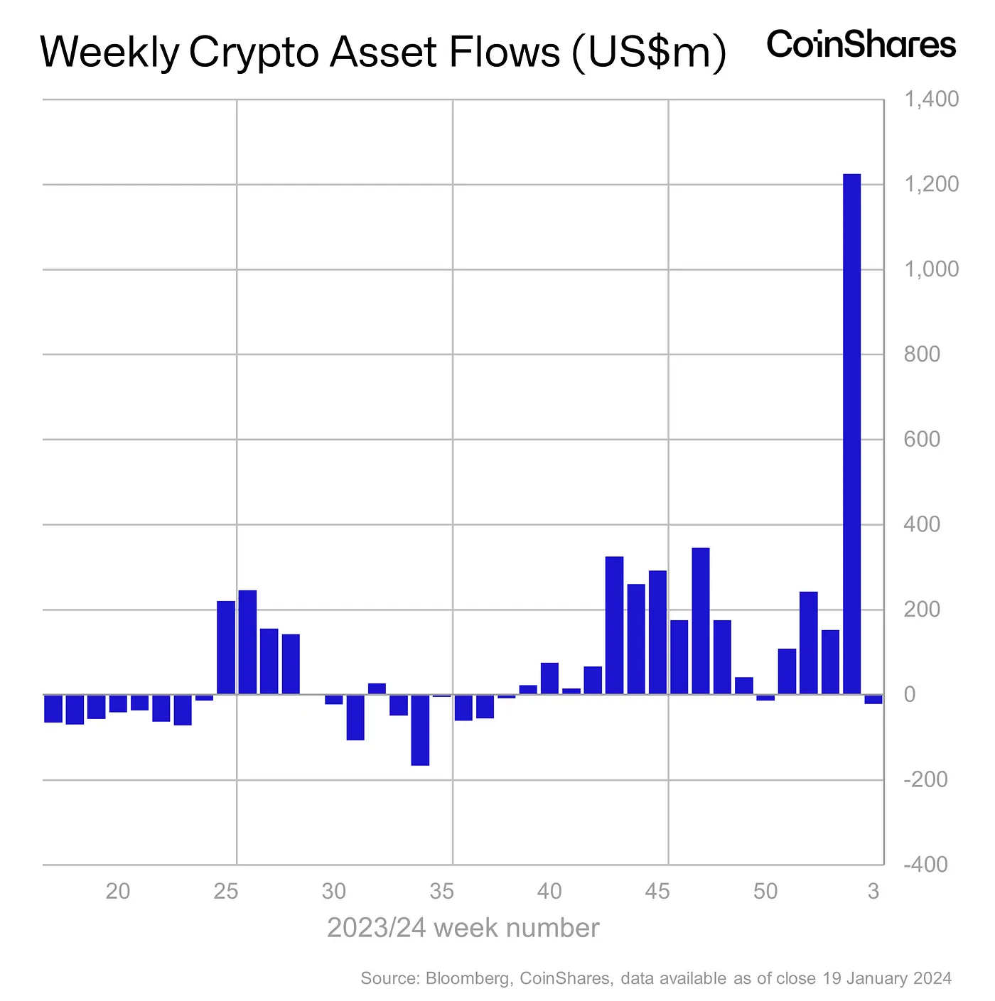 Während digitale Vermögenswerte vergangene Woche insgesamt Abflüsse von 21 Millionen USD verzeichneten, erreichte das Handelsvolumen von Bitcoin satte 11,8 Milliarden US-Dollar. Gegenüber dem wöchentlichen Durchschnitt im Jahr 2023, als Spot ETFs noch nicht zur Produktpalette gehörten, ist das ein siebenfacher Anstieg.