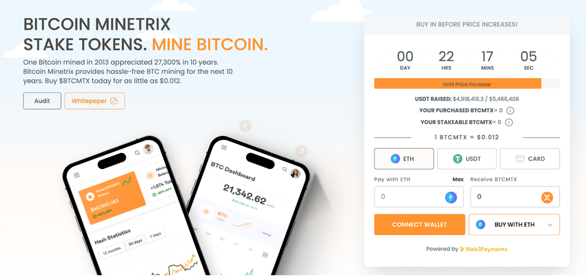 SponsoredDa es Investoren bei $BTCMTX ermöglicht wird, durch das Bitcoin Cloud Mining indirekt von steigenden Bitcoin-Kursen zu profitieren und diese selbst zu schürfen, erfreut sich das Projekt schon während der aktuellen Vorverkaufsphase größter Beliebtheit. Im Presale wurden bereits fast 5 Millionen Dollar umgesetzt. Während des Vorverkaufs erhalten Anleger, die ihre Token staken, eine Rendite in Form von zusätzlichen Token, während das Projekt nach dem Listing an den Kryptobörsen in die Stake to Mine-Phase übergeht und Credits für das Cloud Mining an Investoren übermittelt werden.