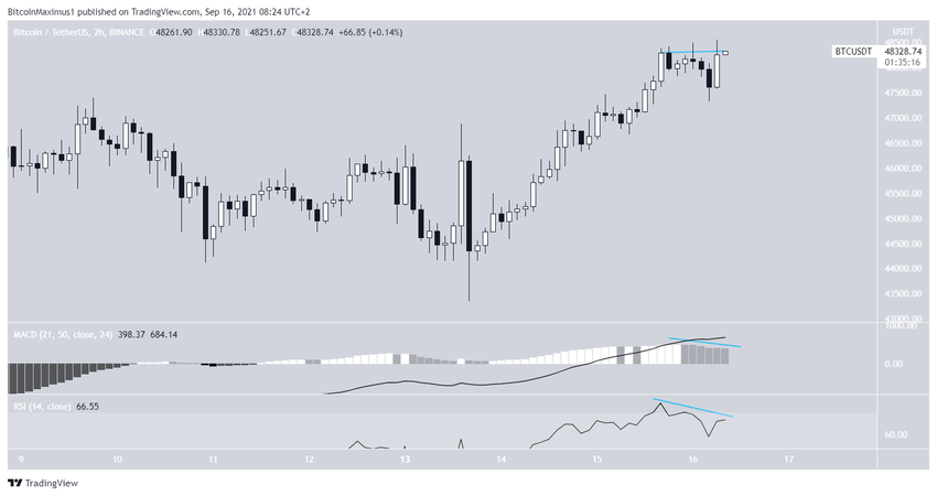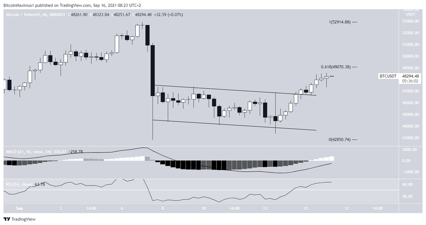 Der Sechs-Stunden-Chart erscheint eher bullisch, da der Ausbruch aus dem absteigenden Parallelkanal bestätigt wurde. Nach dem Ausbruch bestätigte der BTC Kurs den Channel als Unterstützung, bevor er seine Aufwärtsbewegung wieder aufnahm. Darüber hinaus steigen sowohl der MACD als auch der RSI an. Der MACD ist nahezu positiv, während der RSI bereits über 50 gestiegen ist.