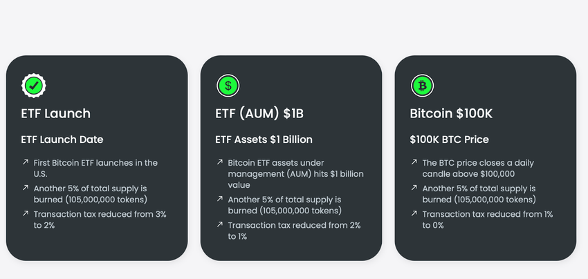 Bei jedem der fünf Meilensteine werden jeweils 5 % der Token verbrannt, was bedeutet, dass insgesamt bis zu 25 % des $BTCETF-Angebots entfernt werden könnten. Zusätzlich wird bei der Notierung an Kryptowährungsbörsen eine Transaktionsgebühr von 5 % erhoben, die mit jedem Ereignis reduziert wird, bis sie letztendlich bei 0 % liegt.