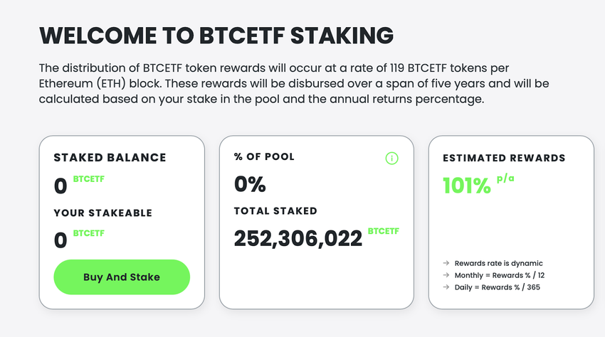 Sponsored SponsoredZusätzlich zur Token-Burn-Funktion bietet $BTCETF eine Staking-Option, bei der Investoren, die ihre Token über einen längeren Zeitraum staken, eine jährliche Rendite (APY) erhalten. Aktuell beträgt diese Rendite 101 %, wird jedoch voraussichtlich sinken, sobald mehr Anleger am Staking Pool teilnehmen. Die attraktiven Renditen haben bereits dazu geführt, dass ein beträchtlicher Teil der Tokens im Staking Pool angelegt wurde. Dies verringert das verfügbare Angebot beim Handelsbeginn, was den Tokenpreis deutlich in die Höhe treiben könnte.