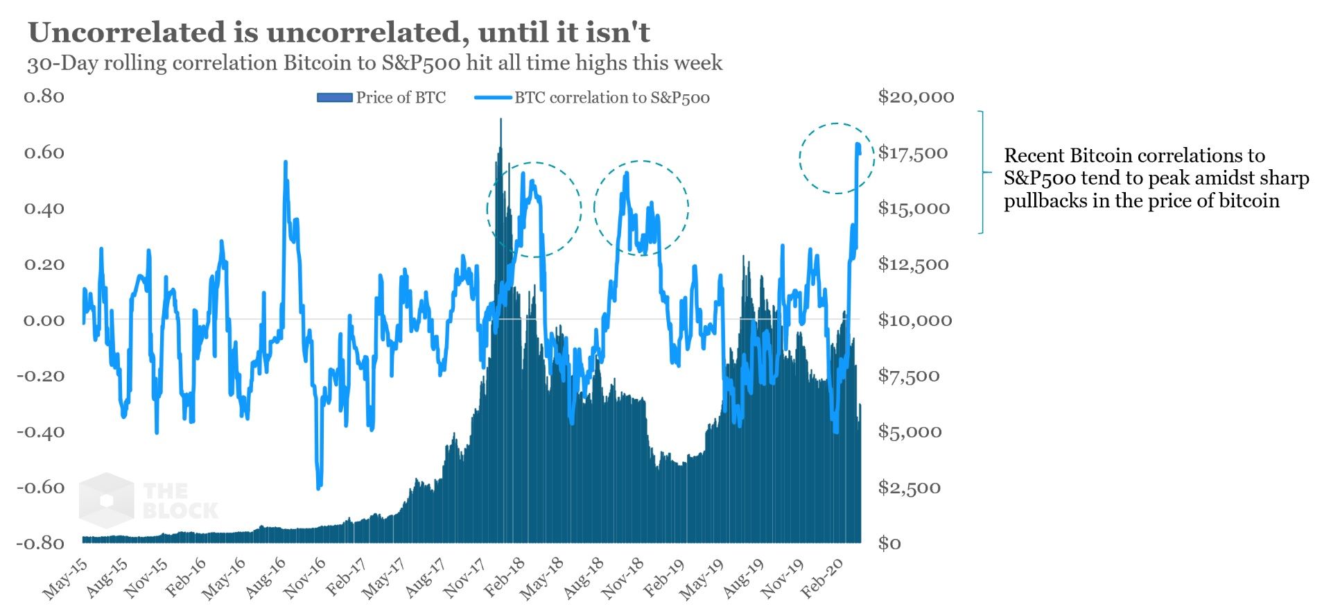 Wie das News-Magazin TheBlock berichtete, befindet sich die rollierende 30-Tages-Korrelation zwischen dem S&P 500 und dem Bitcoin Kurs aktuell auf einem neuen Allzeithoch. Den Daten von The Block, Coin Metrics, FactSet zufolge könnten wir deshalb bald eine weitere Abwärtsbewegung bei der Kryptowährung sehen. Nachdem die Korrelation in der Vergangenheit auf einen Spitzenwert angestiegen war, folgte ein “starker Kursrückgang”, wie TheBlock argumentierte.