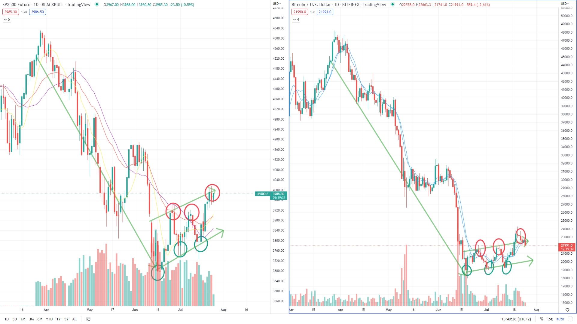 Am Sonntag, dem 19. Juni, erreichte der Bitcoin Kurs dann den letzten Tiefpunkt, während der S&P 500 den letzten Tiefpunkt am 20. Juni erreichte. Der Grund für die Verzögerung ist, dass der S&P 500 am Wochenende nicht gehandelt wird, während der Krypto-Markt rund um die Uhr geöffnet ist. Auch die anderen Tief- und Hochpunkte der letzten Tage stimmen zeitlich fast perfekt überein, wie du auf dem Chart sehen kannst.