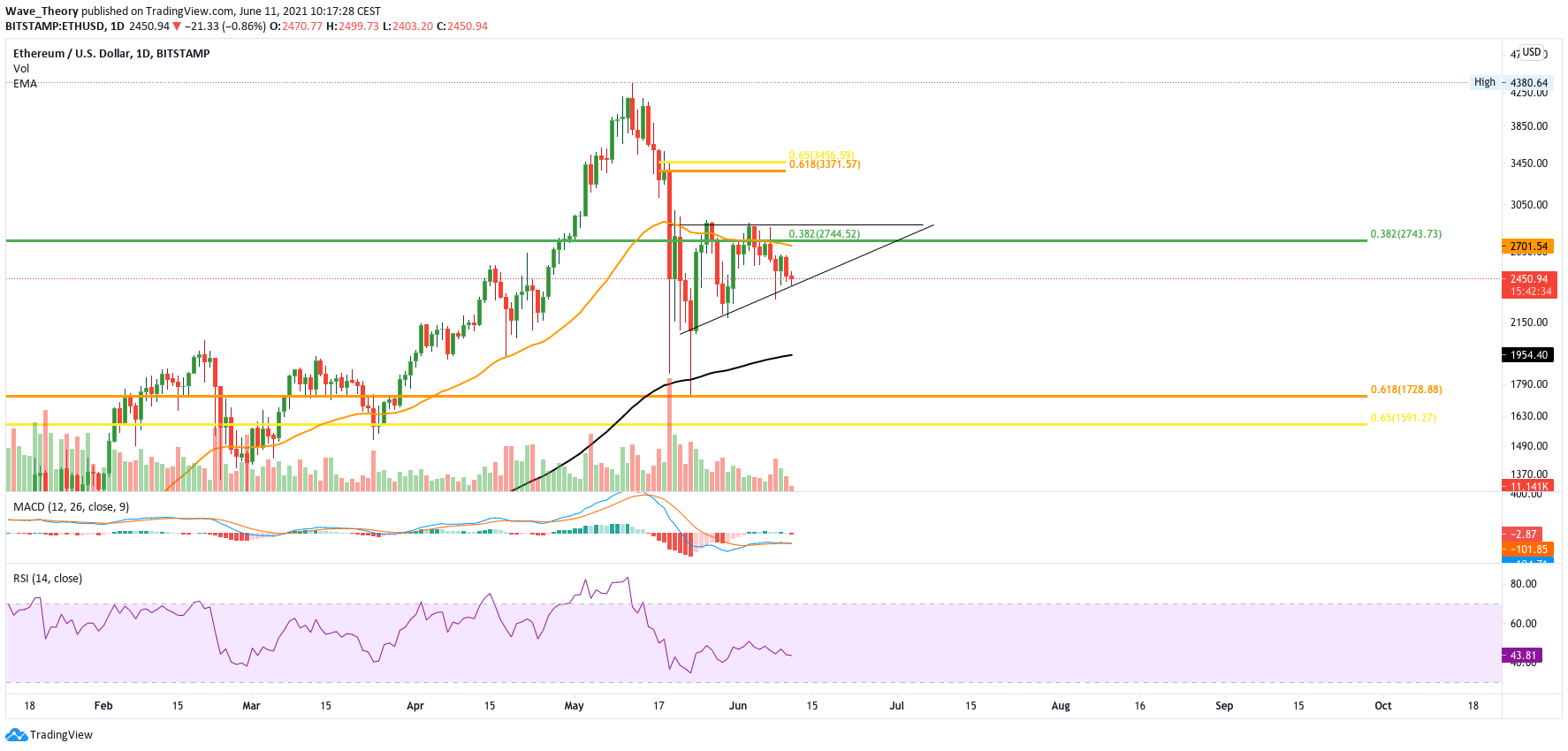 Während es für den Ethereum Kurs letzte Woche noch danach aussah, dass er den Fibonacci Widerstand bei knapp 2.800 USD brechen könne, wurde er vor wenigen Tagen sehr stark daran abgewiesen. Die nächste Unterstützung für den Ethereum Kurs befindet sich bei rund 1.700 USD. Zudem wartet bei 1.950 USD Unterstützung am 200-Tage-EMA für den Ethereum Kurs. Dieser wird aber wohl nicht lange halten können.