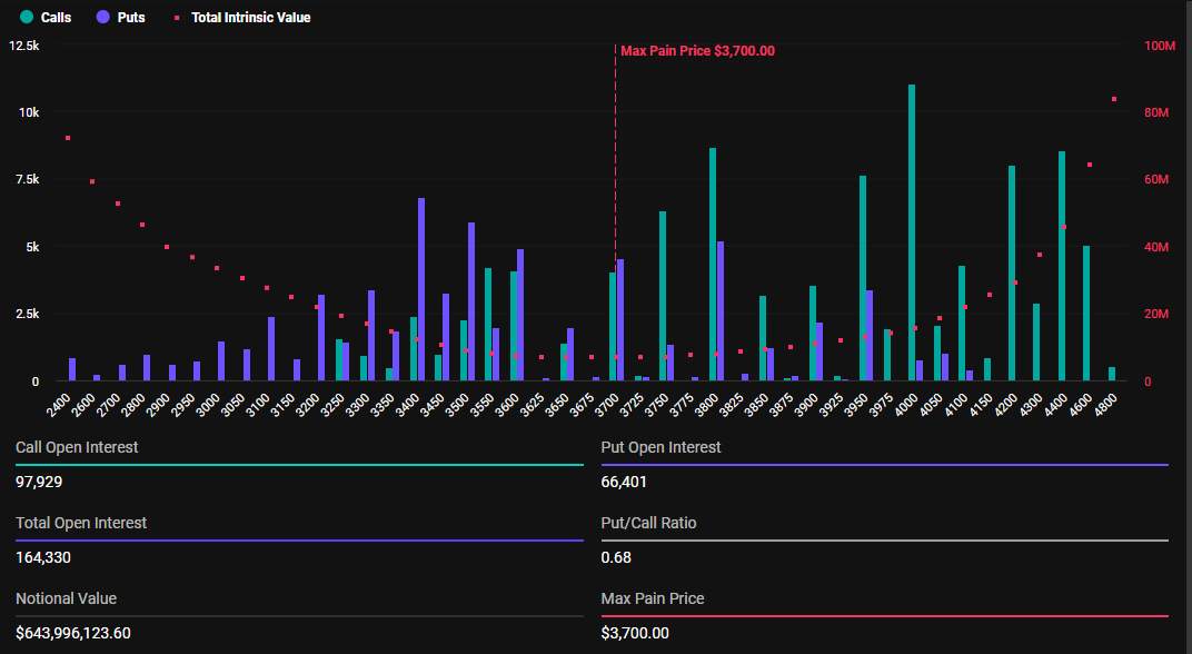 Unterdessen laufen 164.330 Ethereum-Optionsverträge mit einem Nennwert von fast 644 Millionen USD ebenfalls heute aus. Das Put-zu-Call-Verhältnis liegt bei 0,68, was zeigt, dass, ähnlich wie bei Bitcoin, Händler mehr Long-Verträge als Short-Verträge verkaufen.