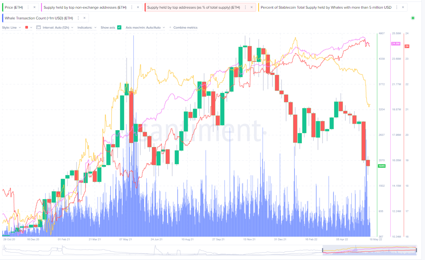 Auf dem Chart unten kannst du den Ethereum Kurs zusammen mit einigen On-Chain-Daten sehen. Das blaue Diagramm zeigt die Zahl der Transaktionen der Whales. Die gelbe Kurve ist der Stablecoin-Anteil der Whales (mindestens 30 Millionen USD), während die rote und die lila Kurve die Top-Ethereum Adressen (1000-100.00 ETH) repräsentieren. Die lila Kurve zeigt die Bestände der nicht-Exchange-Adressen an, während die rote Kurve auch die Bestände auf den Krypto-Börsen beinhaltet. Spannenderweise sind die ETH-Bestände der Whales und Exchange-Wallets und der prozentuale Stablecoin-Anteil im letzten Jahr deutlich gestiegen. Daraus kann man schlussfolgern, dass vor allem die Whales im letzten Jahr große Gewinne mitnahmen oder es schafften, Coins und Stablecoins zu akkumulieren.