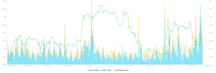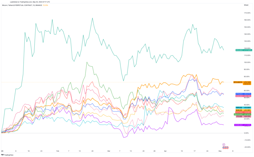 Trotz des damaligen Schocks konnte der Bitcoin Kurs in diesem Jahr eine neue Rallye starten. Seit Anfang 2023 stieg der Preis von BTC um über 70 %. Allerdings scheinen sich die verschiedenen Kryptowährungen seit 30 Tagen auseinander entwickeln, wie auf dem Chart unten zu sehen.