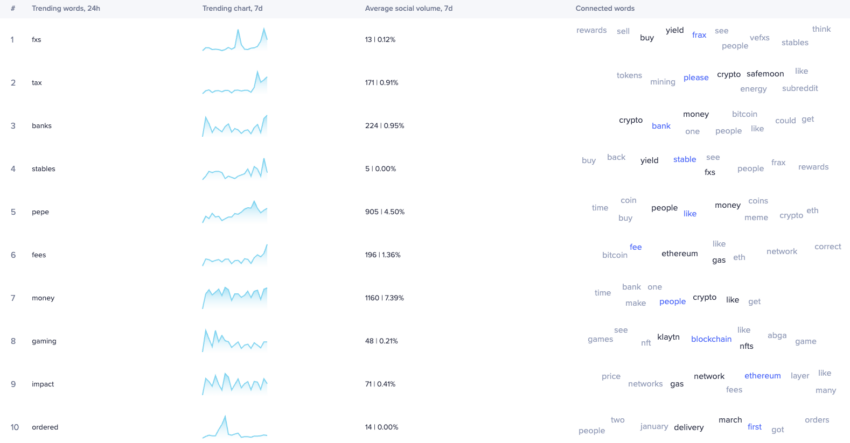 Auch die Krypto-Community stellt sich auf die anstehenden FOMC-Entscheidungen ein. Es sieht so aus, als ob sie sich sogar intensiv damit auseinandersetzt. Wie Daten von Santiment zeigen, suchen die Mitglieder der Community derzeit verstärkt nach geldbezogenen Themen wie Banken, Steuern, Geld, Gebühren und Stablecoins. Das ist ein Hinweis darauf, dass die Community die Geldpolitik genau beobachtet.