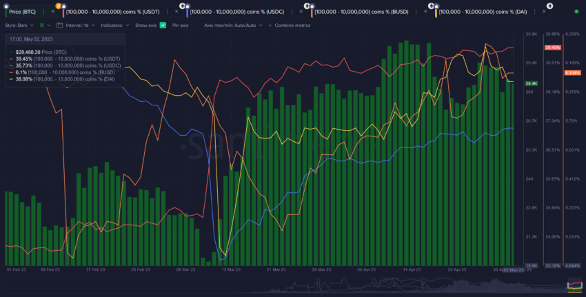 Gleichzeitig akkumulierten die Wale seit Anfang Juni 2022 verstärkt Stablecoins, insbesondere USDT (die rote Linie) und USDC (die blaue Linie).