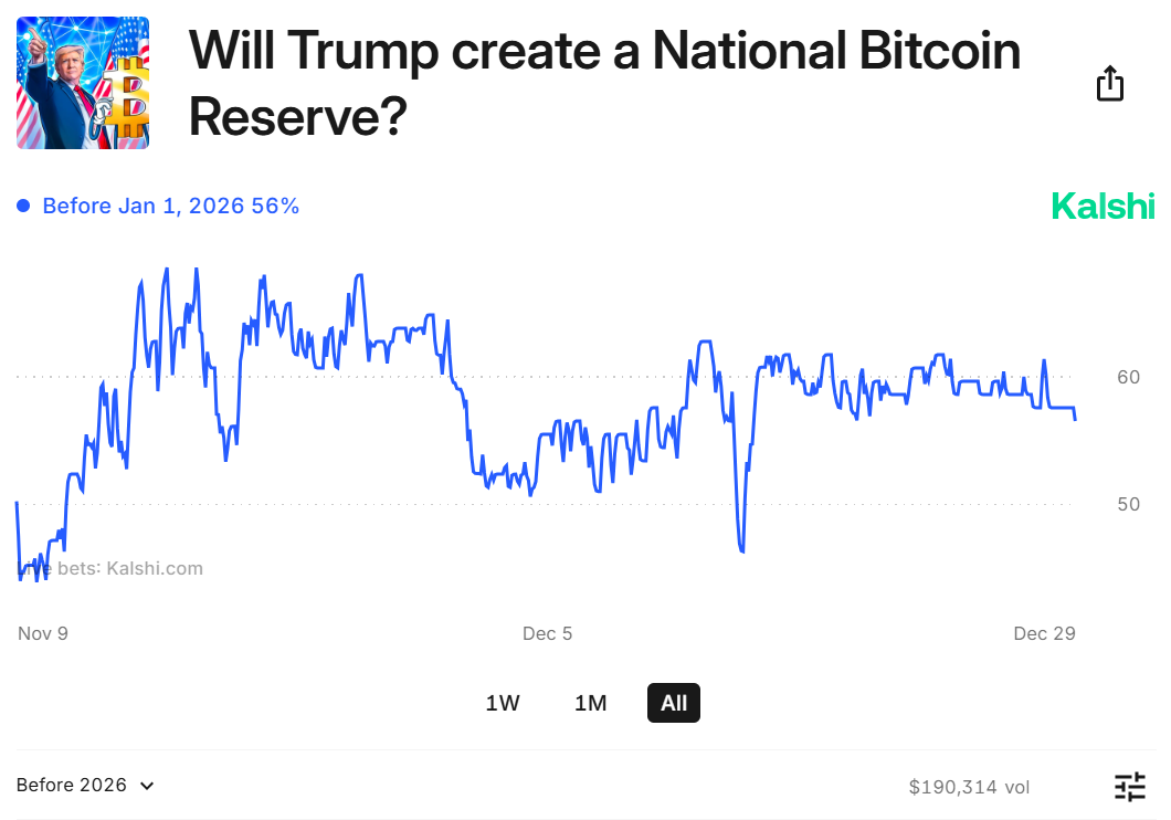 Inzwischen gehen einige Marktbeobachter davon aus, dass dieser Schritt bis 2026 vollzogen werden könnte. Kalshi, eine in New York ansässige Prognosemarktplattform, die für US-Teilnehmer offen ist, schätzt die Wahrscheinlichkeit, dass die Bitcoin-Entwicklung bis Januar 2026 stattfinden wird, auf 56 Prozent.