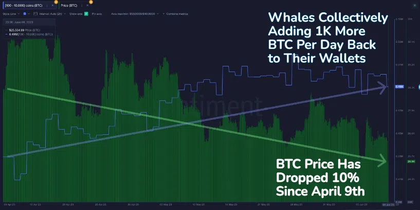 Wie eine aktuelle Analyse von Santiment zeigt, hat die Gruppe der Wale mit Summen zwischen 100 und 10.000 Bitcoin trotz des rückläufigen Marktes weitere 57.578 BTC akkumuliert. Was bedeutet das für den Markt?