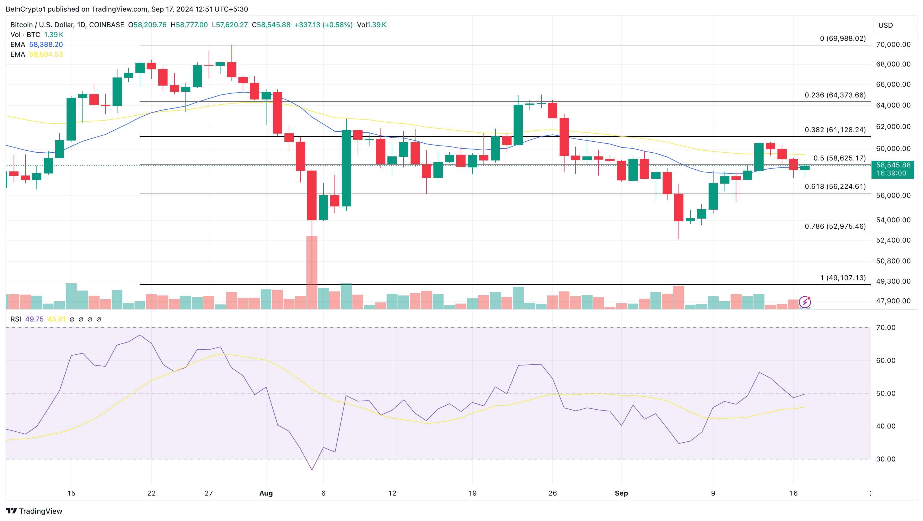 Auf dem Tageschart kämpft der Bitcoin-Kurs mit dem 20-Tage-Exponential Moving Average (EMA). Mit einem Handelskurs von 58.646 USD zeigt diese Position, dass die Bullen noch keinen klaren Weg haben, den Kurs höher zu treiben.