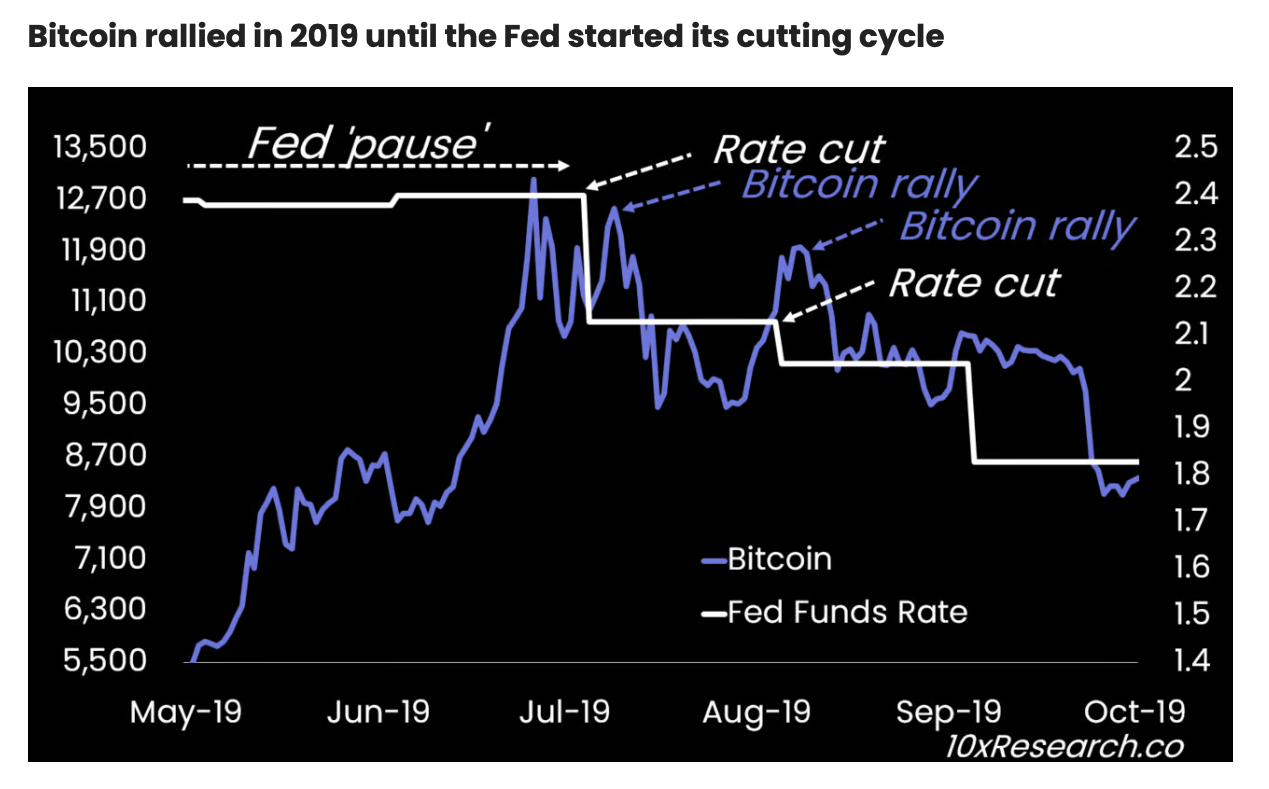 Sponsored Sponsored„Die Federal Reserve sollte eine Zinssenkung um 50 Basispunkte in Betracht ziehen, aber welche Maßnahme sie auch diese Woche ergreift, könnte nicht den signifikanten Liquiditätsschub bieten, den viele erhoffen. Historisch gesehen war die Leistung von Bitcoin nach Zinssenkungen gemischt; zum Beispiel waren die anfänglichen Gewinne nach der Zinssenkung 2019 kurzlebig, und der Kurs fiel einige Monate später um 30 Prozent“, betonte Thielen hervor.