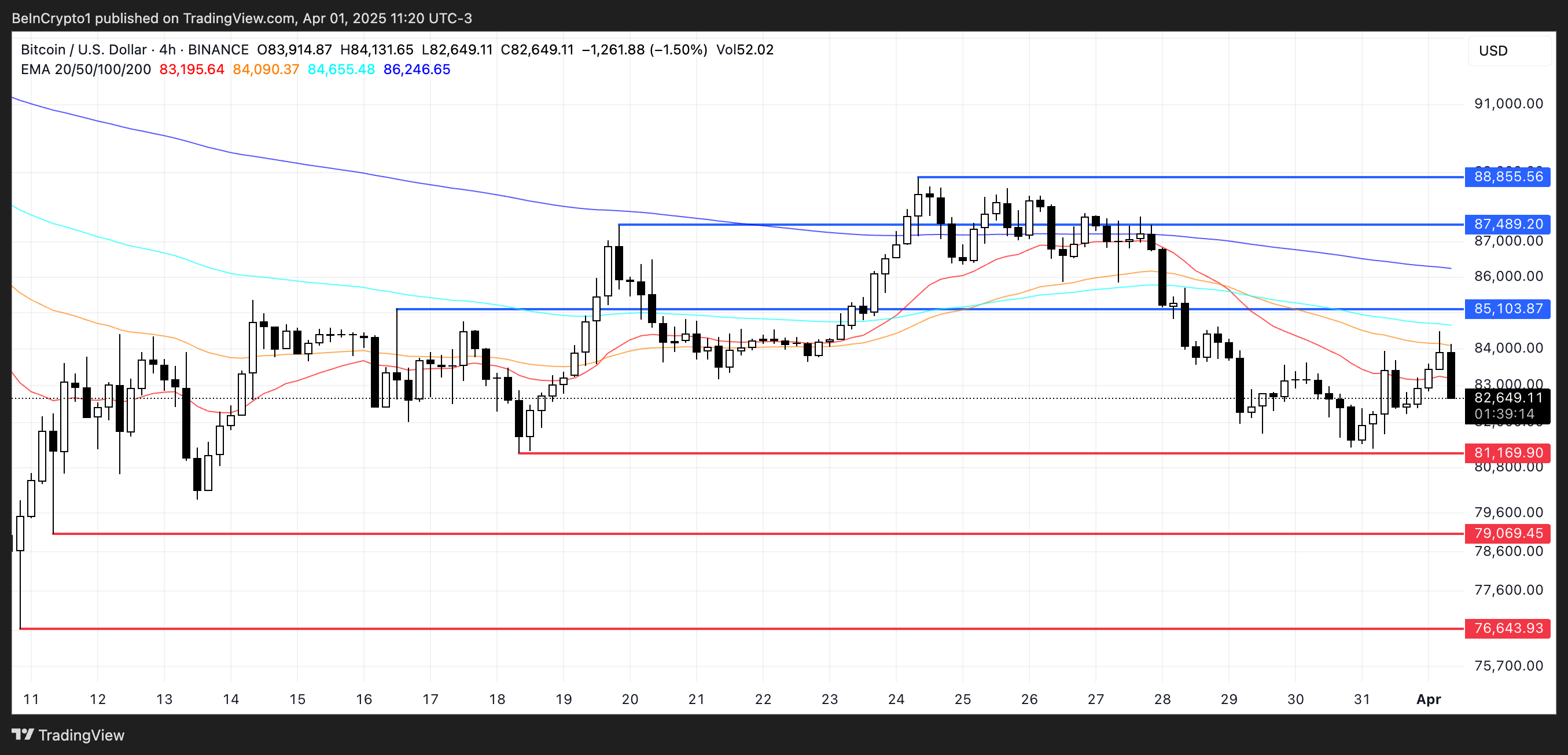Sponsored SponsoredNic Puckrin, Krypto-Analyst und Gründer von The Coin Bureau, sagte zu BeInCrypto, dass die Unsicherheit des Marktes vor den sogenannten „Befreiungstag“-Zöllen zugenommen hat. Er merkt an, dass Bitcoin gleichermaßen für eine starke Bewegung in beide Richtungen positioniert ist. Es könnte möglicherweise auf 73.000 USD fallen oder in Richtung 88.000 USD steigen: