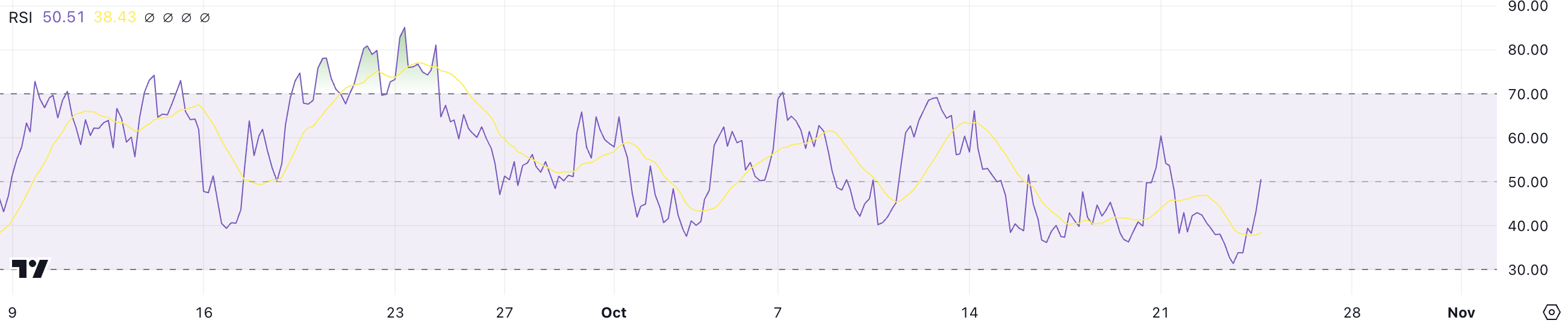 Der Relative Strength Index (RSI) misst den Schwung, indem er angibt, ob ein Vermögenswert überkauft oder überverkauft ist. Ein RSI von 50 bedeutet, dass die Marktstimmung für TAO derzeit ausgeglichen ist.