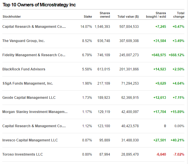 BlackRock, andere institutionelle Firmen und Banken investierten im ersten Quartal 2023 bereits Millionenbeträge in MSTR. Wie Daten von CC zeigen, hält BlackRock derzeit sogar rund 6 % der Unternehmensanteile – diese sind zu dem aktuellen MSTR Kurs umgerechnet über 200 Millionen US-Dollar wert. Auch der 4,5 Billionen US-Dollar Asset-Manager Fidelity zeigte sich im ersten Quartal optimistisch und versechsfachte sein Investment in das Unternehmen.