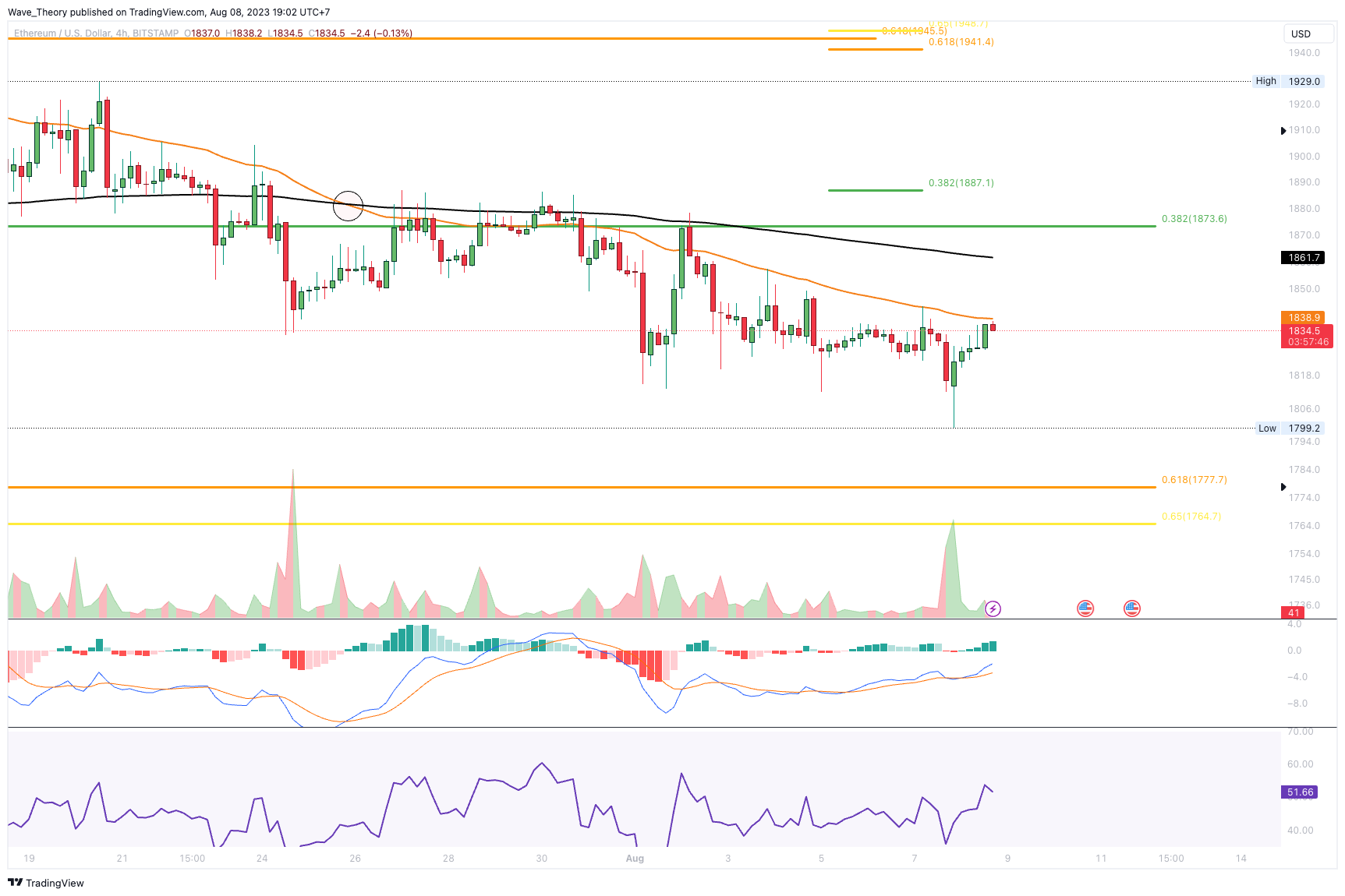 Im 4H-Chart liegt hingegen ein Death Cross vor, womit der Trend kurzfristig bärisch bestätigt ist. Zudem scheint Ethereum jetzt bereits am 50-4H-EMA Widerstand bei rund 1.839 USD auf bärische Ablehnung zu stoßen. Wenn der ETH Kurs daran bärisch abgewiesen wird, wartet bei rund 1.777 USD die nächste signifikante Fib Unterstützung. Dort fungiert zudem der 200-Tage-EMA als zusätzliche Unterstützung.