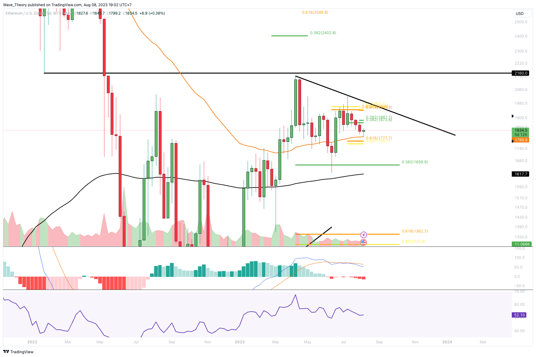 Dass der Ethereum Kurs bereits eine Aufwärtsbewegung initiiert, ohne die Golden Ratio bei rund 1.777 USD erreicht zu haben, liegt daran, dass der Kurs aktuell am 50-Wochen-EMA bei rund 1.800 USD abprallt. Wenn diese Unterstützung bricht, fällt der Kurs womöglich zur Golden Ratio bei rund 1.777 USD zurück. Hält auch diese Unterstützung nicht, wartet bei rund 1.660 USD die nächste signifikante Fib Unterstützung auf den ETH Kurs.
