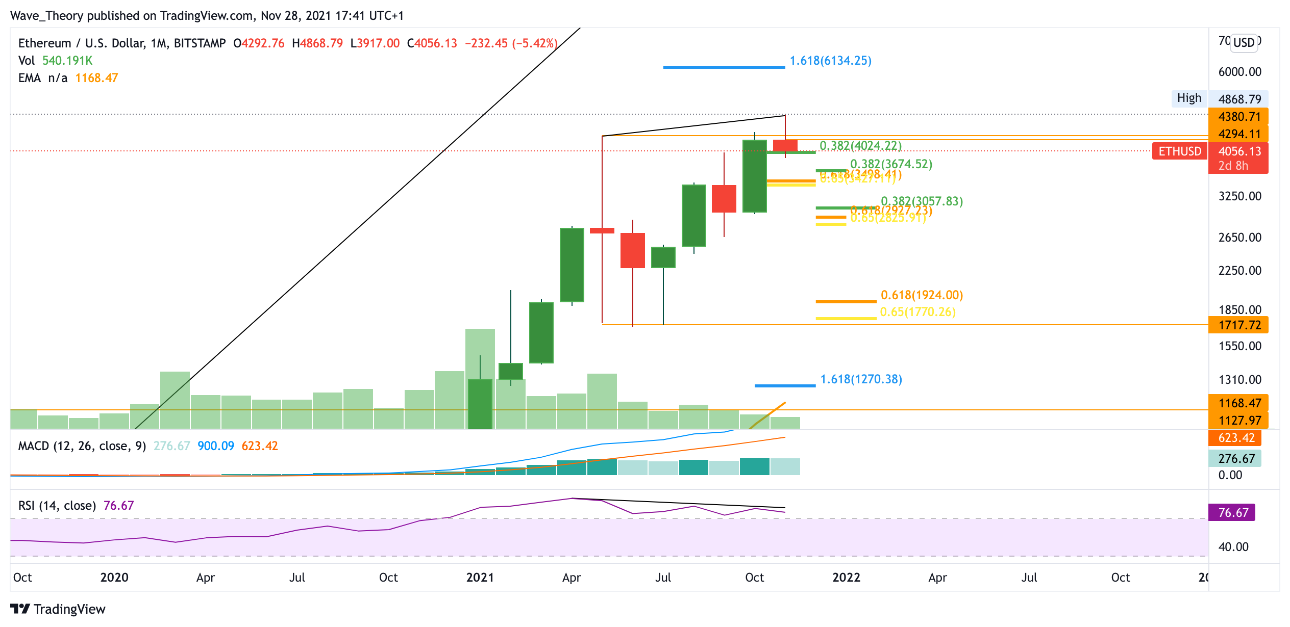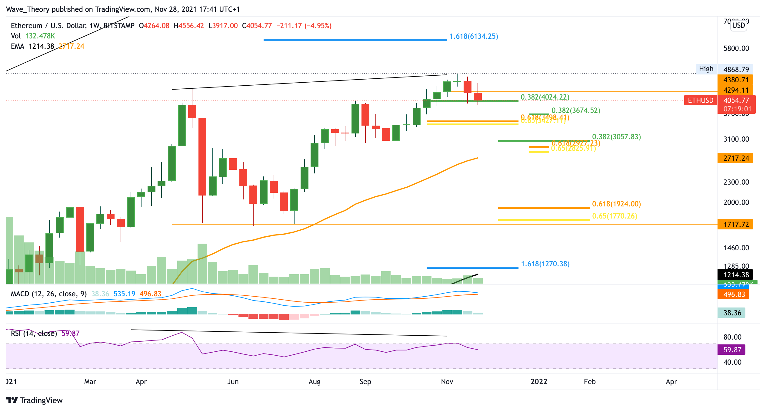 Der Ethereum Kurs könnte tatsächlich auch im Monatschart über dem Fib Niveau bei rund 4.000 USD schließen, denn es bleiben nur noch wenige Tage bis zum Monatsschluss. Das Histogramm des MACDs zeigt sich diesen Monat aber eher bärisch. Ob der Ethereum Kurs im Dezember auf 3.000 USD fällt, oder sich in Richtung der 6.000 USD Marke aufmacht, steht noch in den Sternen. Schlussendlich befindet sich der Ethereum Kurs noch immer inmitten einer Korrekturphase, bei der es lediglich die Chance gibt, dass diese mild verläuft. Der kurzfristige Trend ist also bärisch, mit bullischen Chancen.