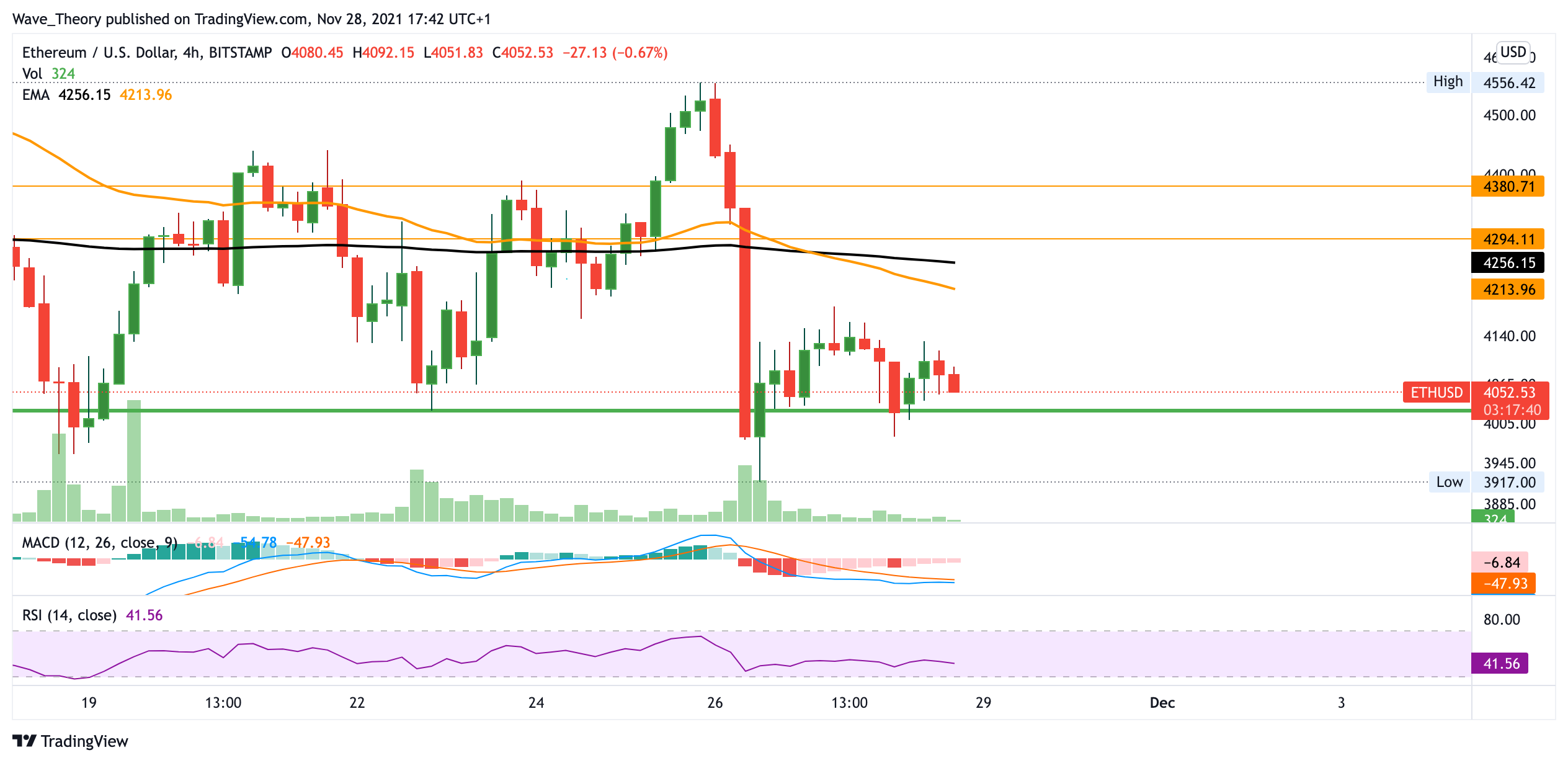 Im 4H Chart entwickelt sich der MACD hingegen bullisch, jedoch etablierte sich ein Death Cross der EMAs. Daher ist der Trend kurz-bis mittelfristig bärisch bestätigt, jedoch könnte Ethereum nach wie vor erneut an der Fib Unterstützung bei rund 4.000 USD abprallen. Sollte dies eintreten, findet der ETH Kurs bereits bei 4.400 USD seinen nächsten Widerstand.