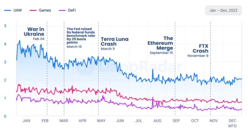 Bereits im Jahr 2021 überholte der UAW des Gaming-Sektors den des DeFi-Sektors und machte 49 % der gesamten Blockchain-Nutzung aus.