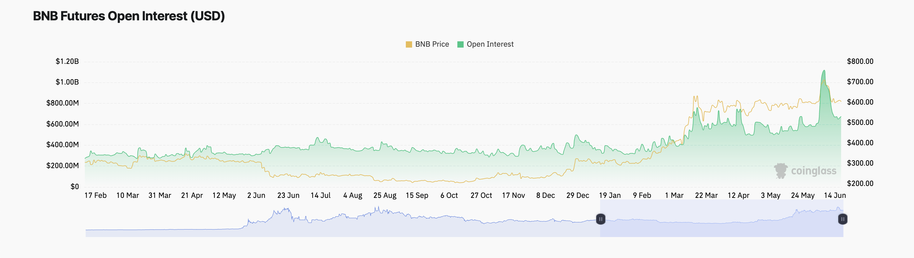 Der BNB Kursrückgang in den letzten zwei Wochen führte zu einem Rückgang des offenen Interesses an Futures. On-Chain-Daten zeigen, dass am 8. Juni das offene Interesse an Futures des Altcoins auf einen Jahreshöchststand von 1,12 Milliarden USD stieg und seitdem gesunken ist.