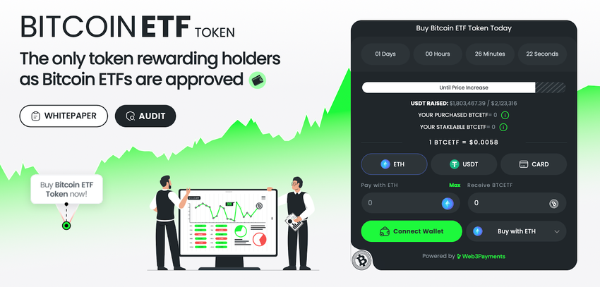 Mit dem Bitcoin ETF Token (BTCETF) kommt ein neues Kryptoprojekt, das sich eng an die Fortschritte der Spot Bitcoin Exchange-Traded Funds (ETFs) in den USA anlehnt. Seit dem Beginn seines Vorverkaufs, der innerhalb von drei Wochen mehr als 1,8 Millionen Dollar eingebracht hat, hat der BTCETF-Token bereits erhebliches Interesse in der Kryptogemeinschaft geweckt.