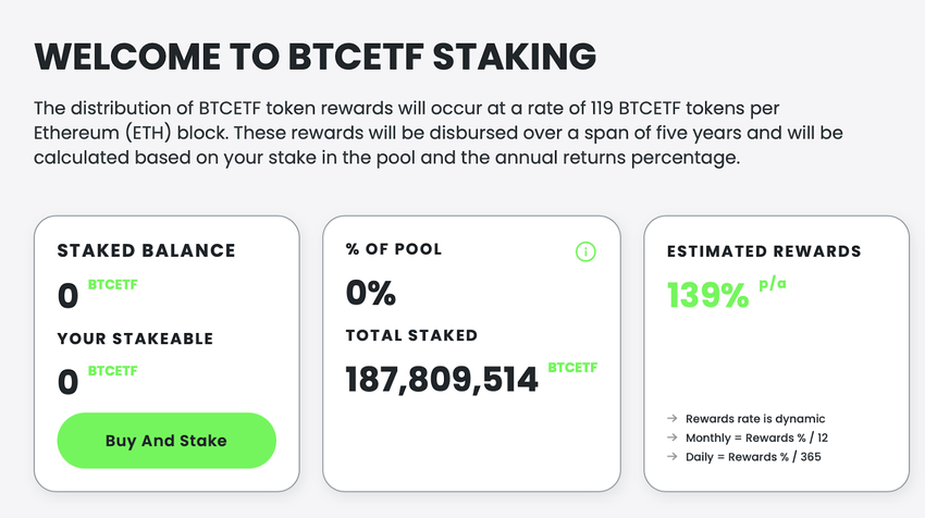 Darüber hinaus bietet der BTCETF-Token eine attraktive Staking-Funktion, die auch schon während des Presales genutzt werden kann. Mit einer jährlichen Rendite (APY) von derzeit 139 % wurden bereits über 187 Millionen Token in den Staking Pool eingezahlt. Die APY variiert mit der Größe des Staking Pools und kann sich auch langfristig im hohen zweistelligen Bereich einpendeln. Ein hoher Staking-Anteil könnte den Verkaufsdruck zum Zeitpunkt des Börsenstarts mindern und zu einer signifikanten Kurssteigerung beitragen.