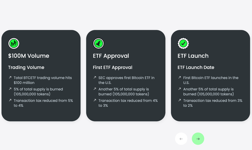 Eine der besonderen Eigenschaften des BTCETF-Tokens ist seine einzigartige Token-Burn-Mechanik, die auf Schlüsselereignisse im Bereich der Bitcoin ETFs in den USA reagiert. So führt beispielsweise die Genehmigung des ersten Bitcoin ETFs durch die US-Börsenaufsicht SEC zur automatischen Vernichtung von 5 % der BTCETF-Token. Folgt nach der Zulassung die Markteinführung des ersten Fonds werden weitere 5 % geburnt. Mit insgesamt fünf möglichen Ereignissen, die zu Token Burns führen, könnte bis zu einem Viertel des Gesamtangebots vernichtet werden, was den Wert der verbleibenden Token potenziell erhöht.