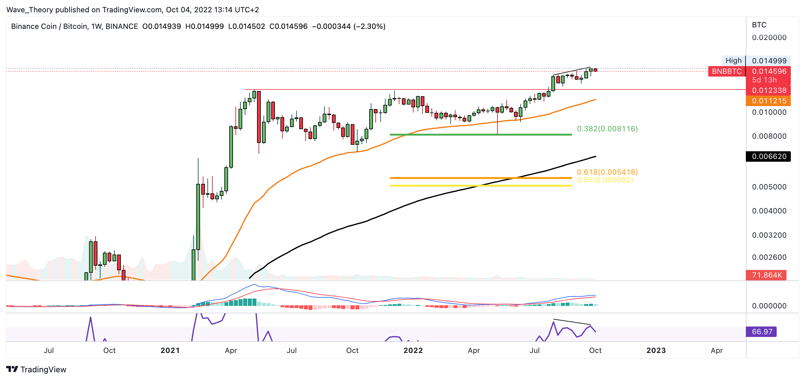 Sollte BNB jetzt fallen, findet BNB spätestens bei rund 0,012338 BTC signifikante Unterstützung und später am 50-Wochen-EMA bei rund 0,011215 BTC.