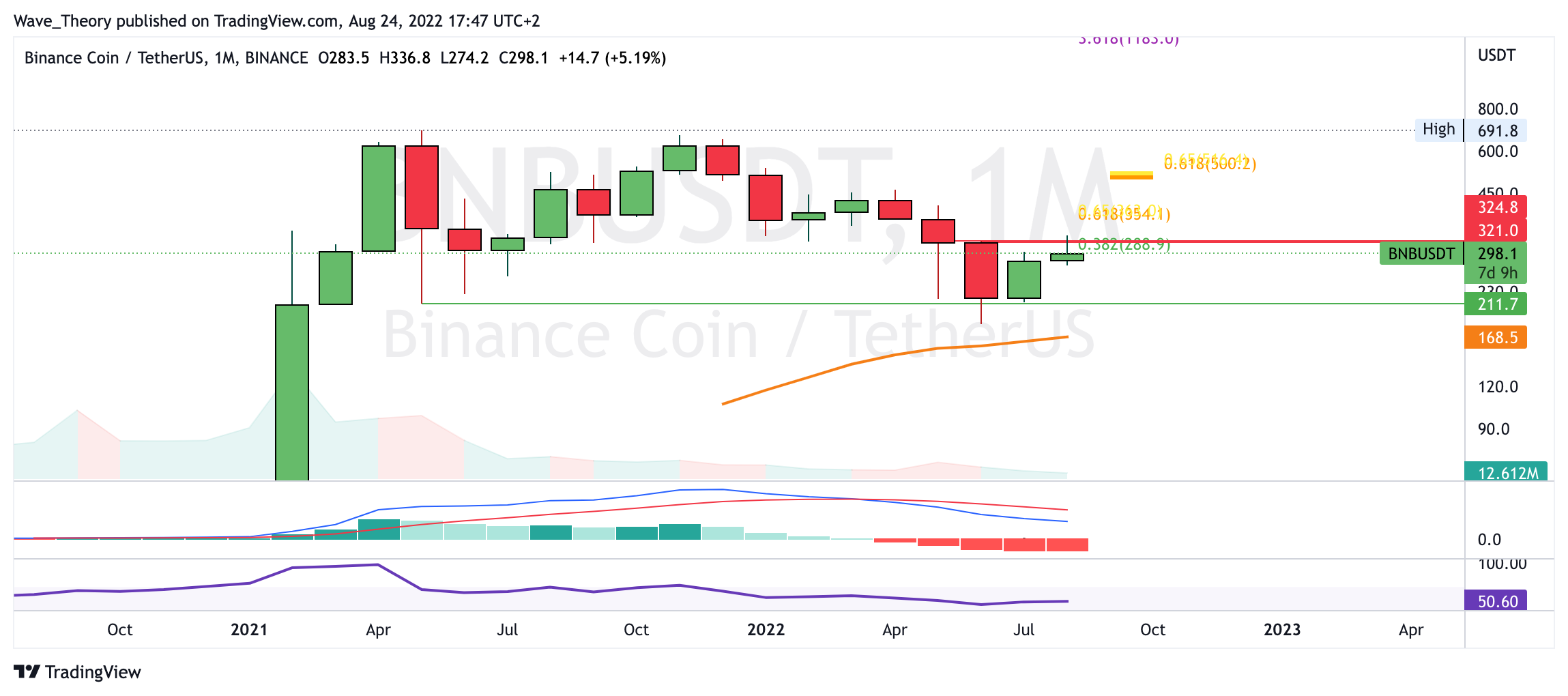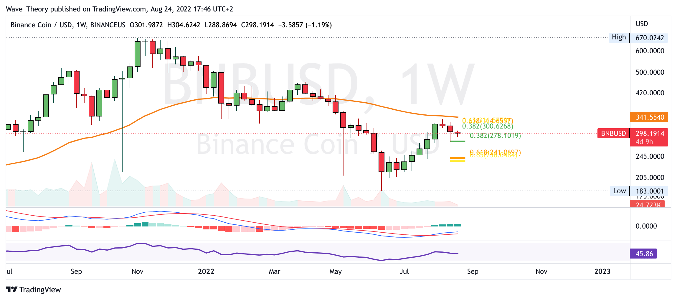 Im Wochenchart bleibt der MACD eindeutig bullisch, denn das Histogramm tickt bullisch höher und die MACD Linien bleiben bullisch überkreuzt. Sollte BNB jedoch den 0,382 Fib Widerstand bei rund 300 USD nicht brechen können, wird BNB womöglich zur 0,382 Fib Unterstützung bei rund 278 USD zurückkehren.