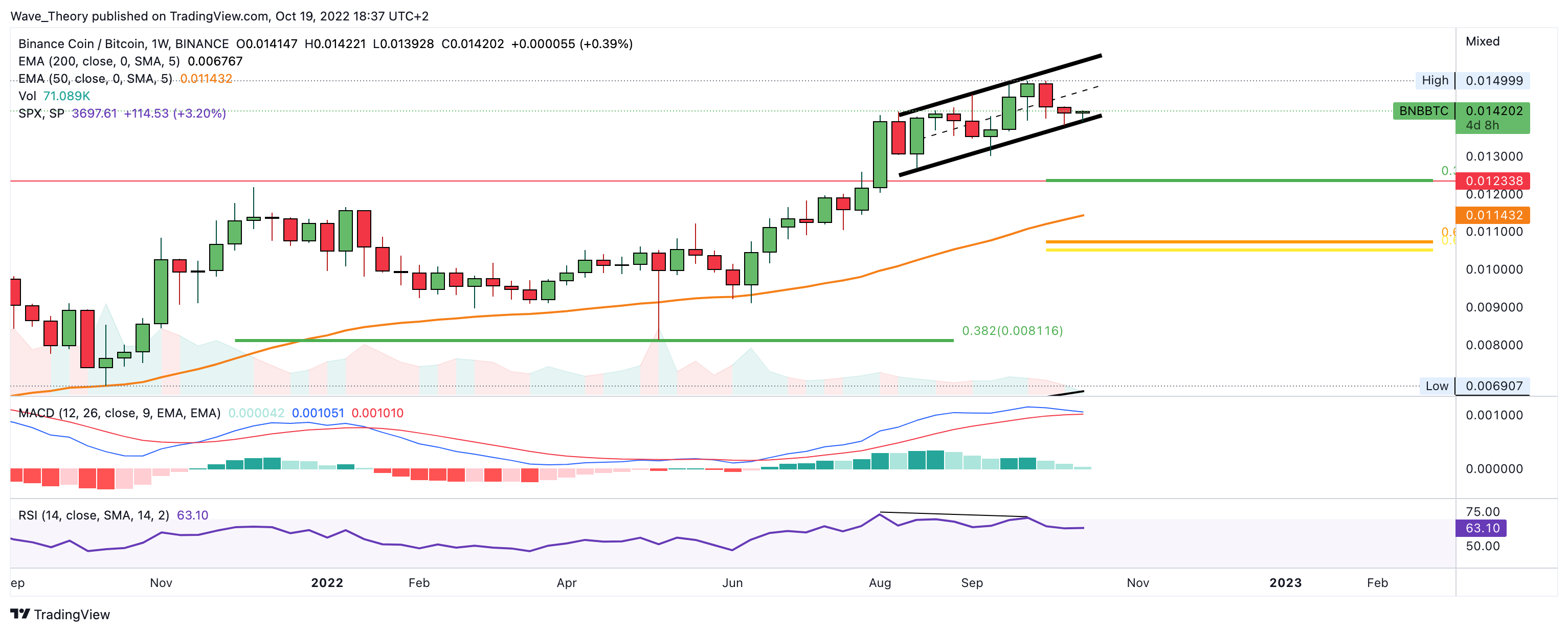Damit könnte BNB jetzt auf rund 0,01236 BTC korrigieren, um am 0,382 Fib Niveau abzuprallen.”