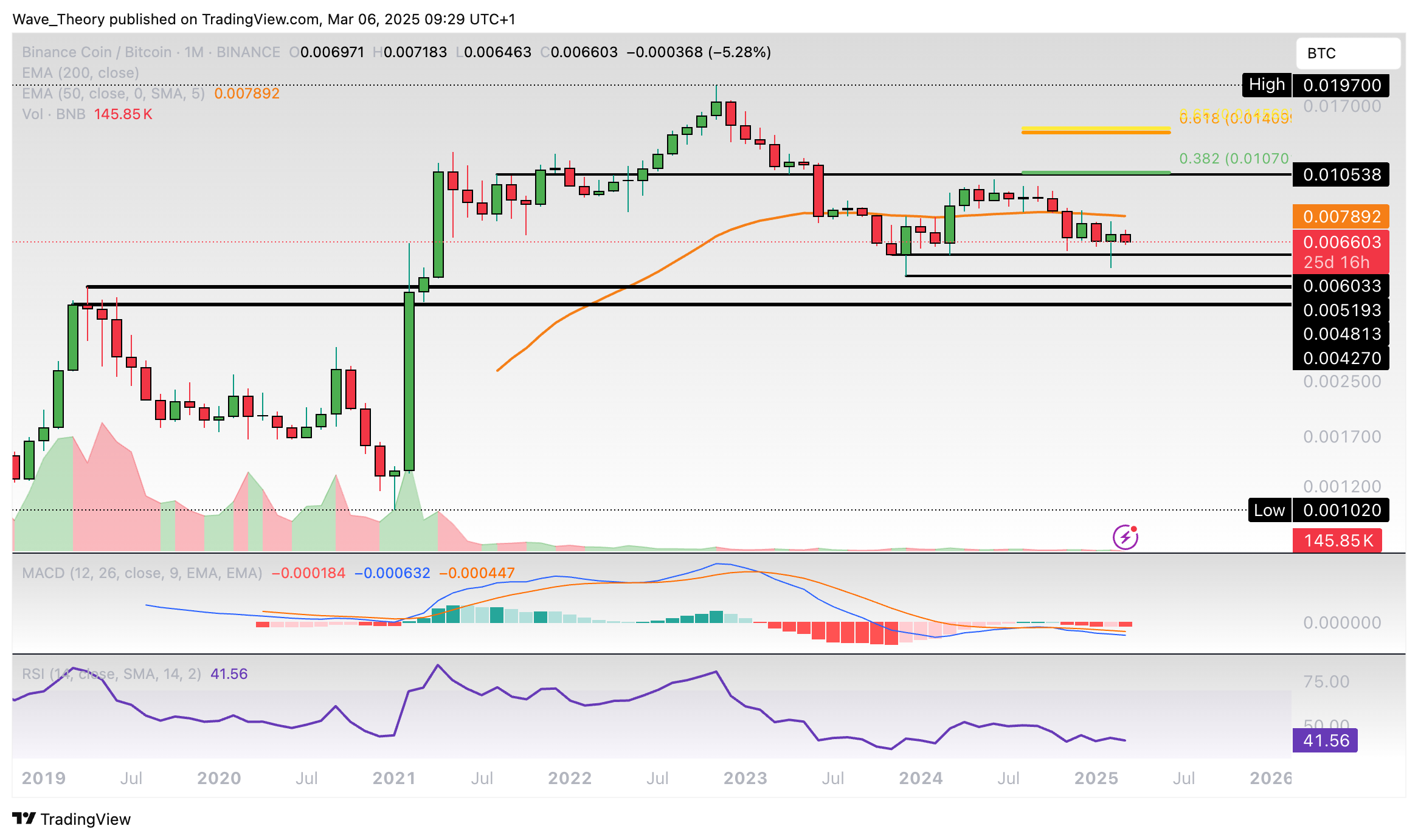 Auf Widerstand stößt BNB bereits am 50-Monate-EMA bei rund 00079 BTC. Die Indikatoren zeigen sich dabei eher bärisch im Monatschart.