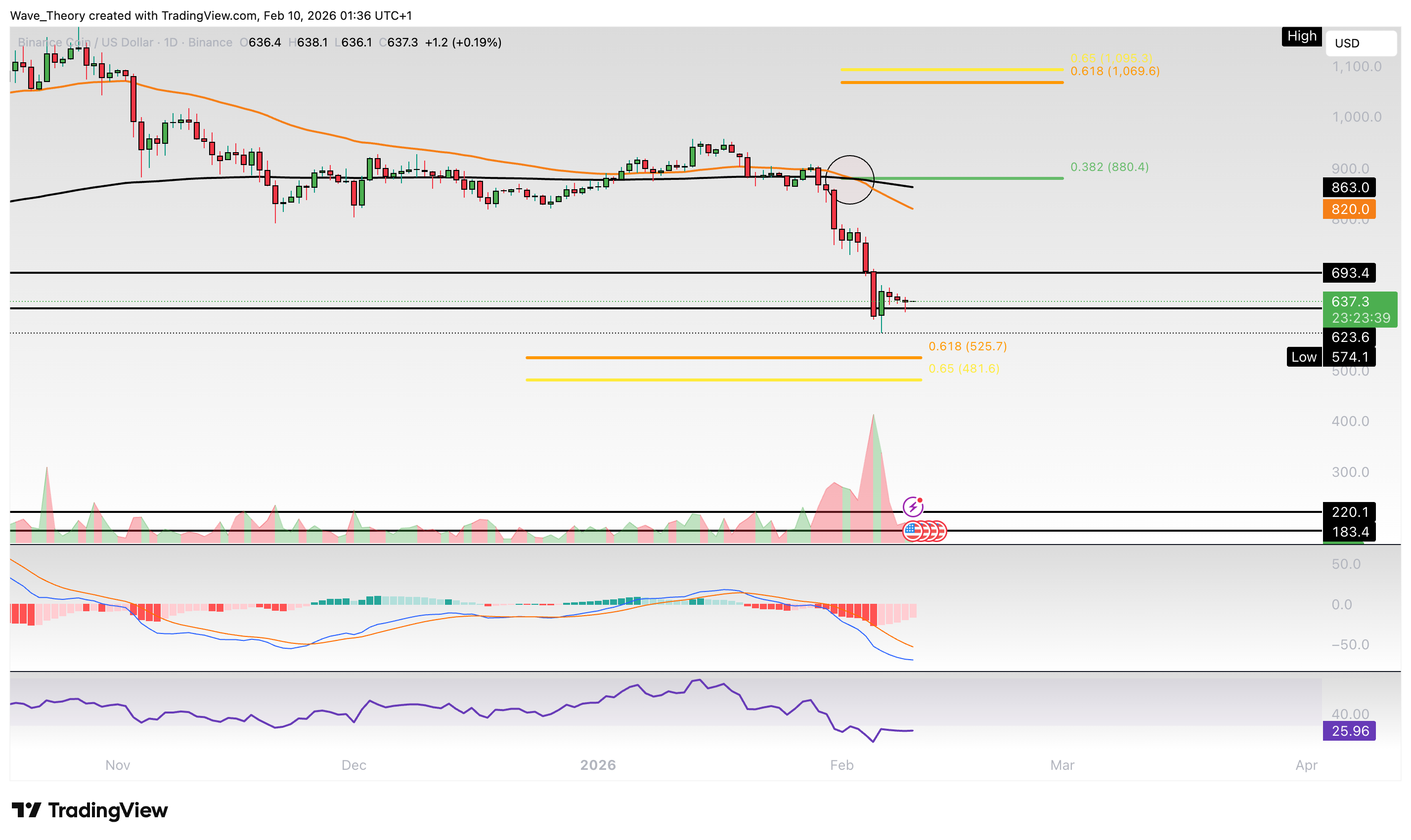 Derzeit stößt der Kurs zwischen rund 623 USD und 693 USD auf historische Unterstützung. Sollte diese Unterstützung nicht halten, wartet am 50-Monate-EMA und Golden Ratio Niveau zwischen rund 480 USD und 536 USD signifikante Unterstützung.