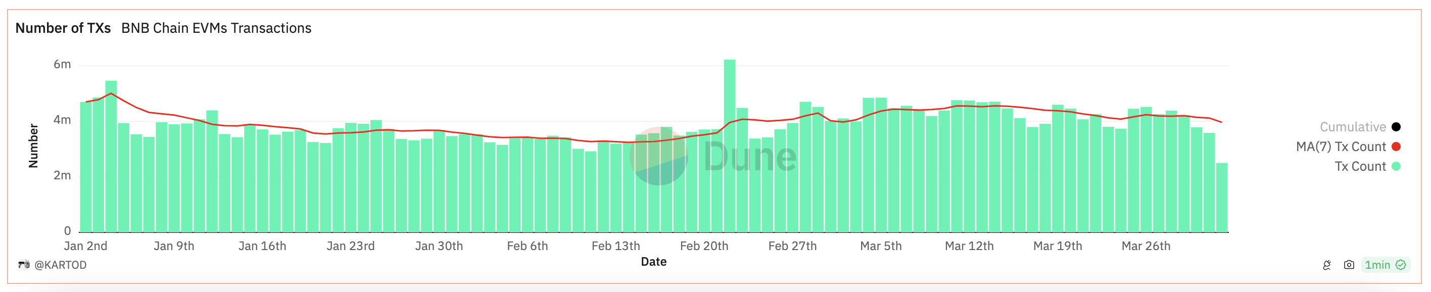 Seine täglichen Transaktionen erreichten am 22. Februar einen Höhepunkt von 6,2 Millionen. In den letzten Tagen jedoch ist diese Metrik konstant gefallen. Sie sank von 4,4 Millionen am 28. März auf 3,6 Millionen am 31. März. Das ist der niedrigste Stand seit dem 25. Februar.