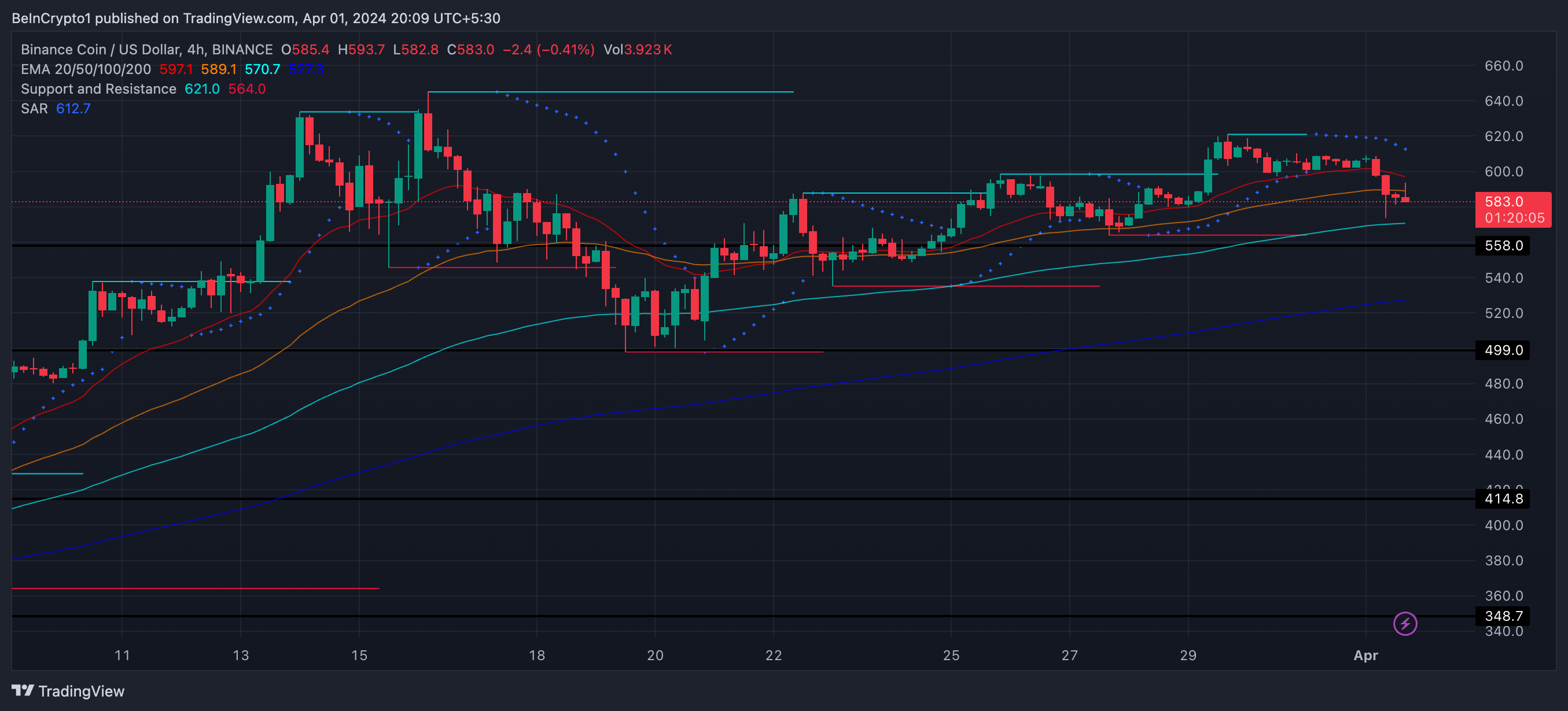 Zwischen dem 28. und 31. März erlebte BNB eine Aufwärtsphase, wie aus dem SAR Wert hervorgeht, in dem der Kurs von 564 USD auf 620 USD stieg.