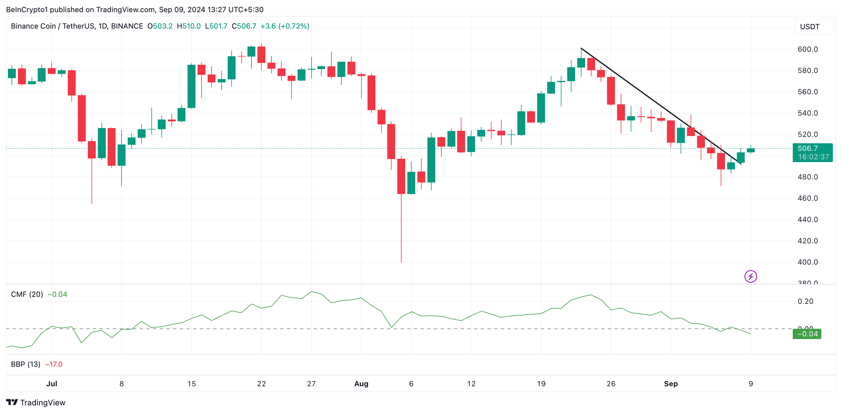 Nachdem BNB am 23. August einen Höchststand von 600 USD erreicht hatte, verzeichnete die Kryptowährung zunehmende Verkäufe, was den Kurs unter eine absteigende Trendlinie drückte. Dieses bärische Muster tritt auf, wenn der Verkaufsdruck ein Asset daran hindert, über ein Widerstandsniveau zu steigen.