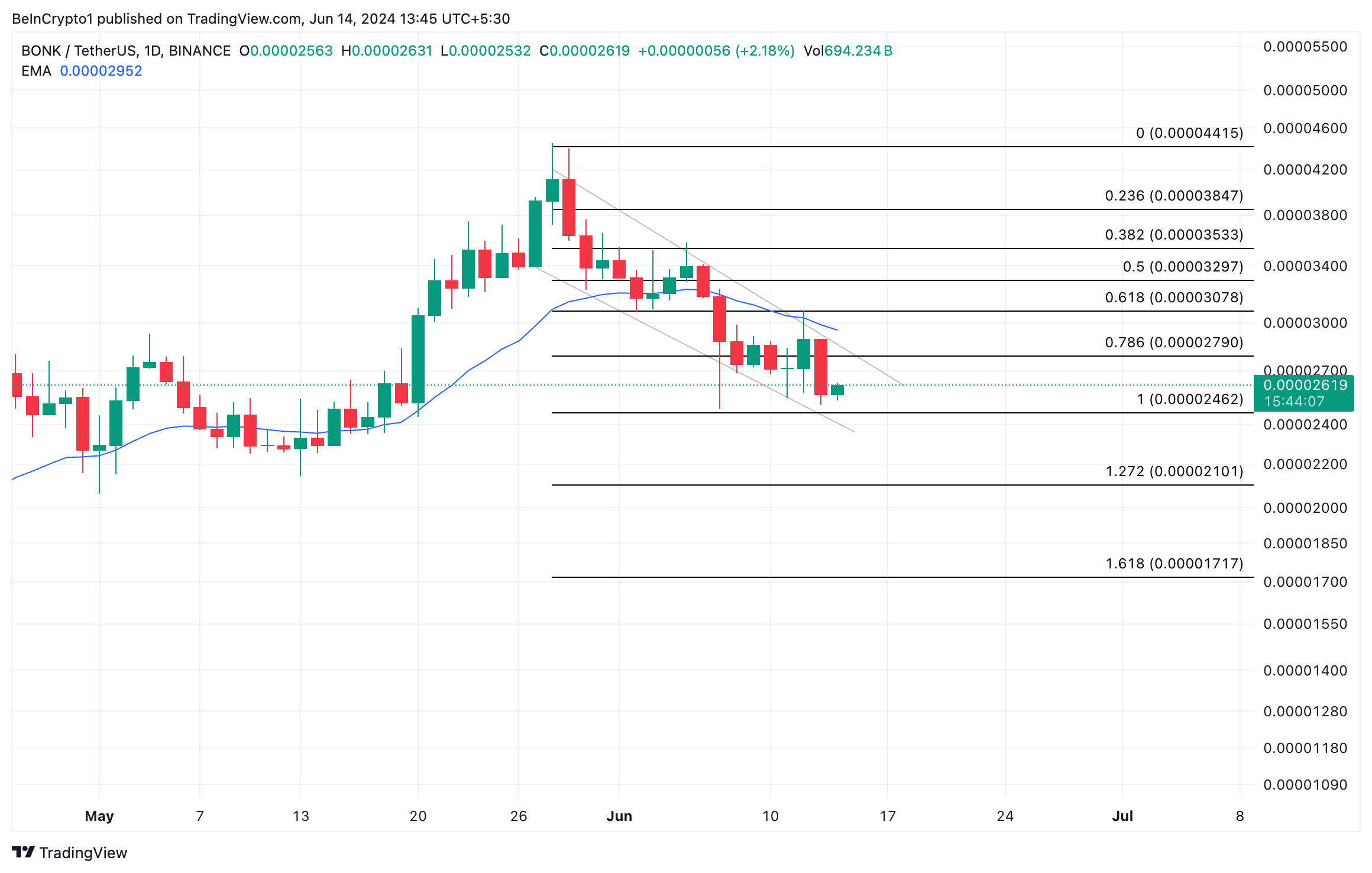 Die obere Linie des Kanals bildet den Widerstand. Im Fall von BONK liegt dieser bei 0,000044 USD. Die untere Linie repräsentiert die Unterstützung; für BONK liegt diese bei 0,000023 USD. Seit der Memecoin von der Kursmarke 0,000041 USD zu fallen begann, sank sein Wert um 36 Prozent und so handelt der Coin bei aktuell 0,000026 USD.
