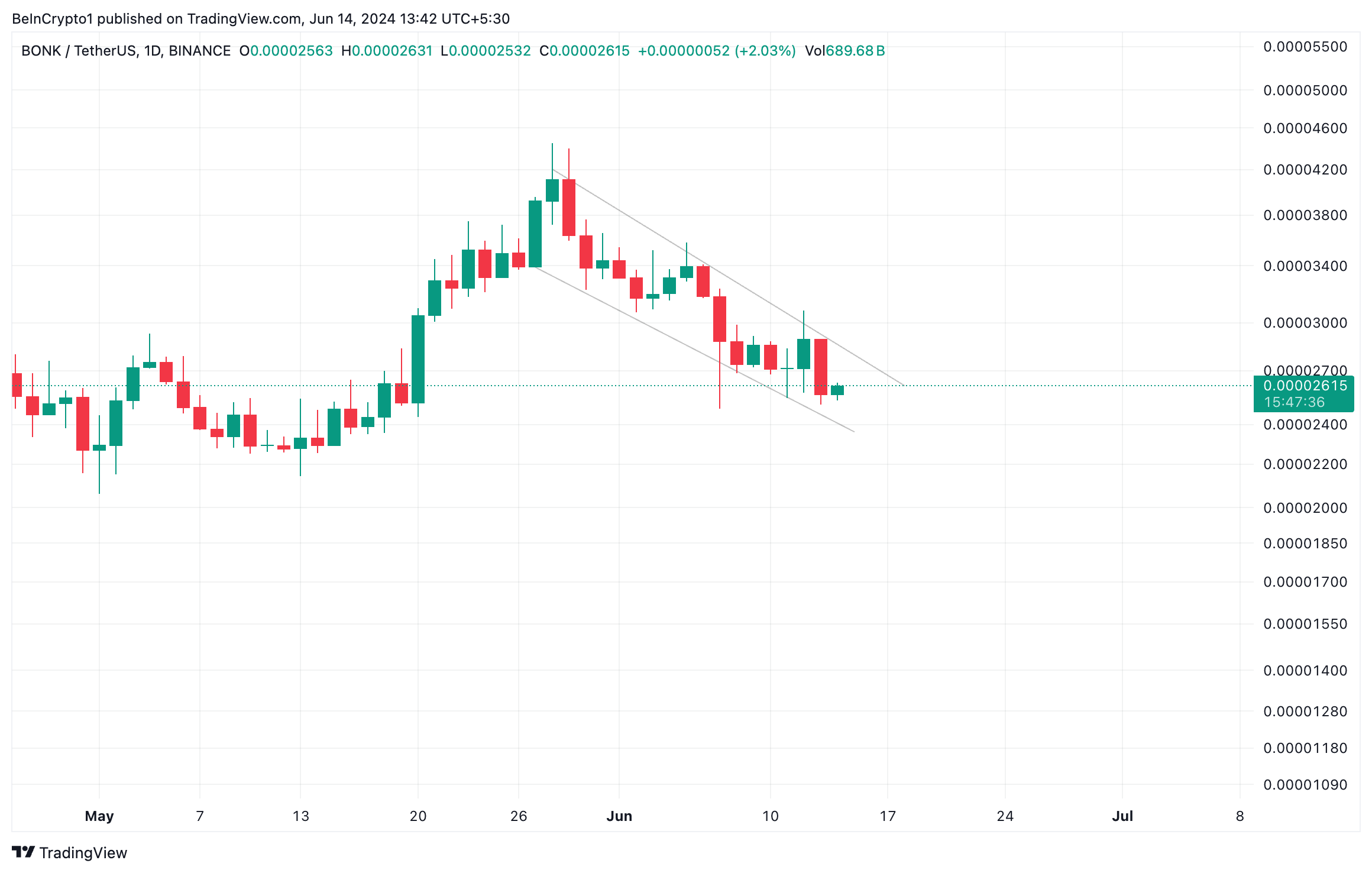 Bonk (BONK) schließt am 28. Mai auf einem mehrmonatigen Hoch von 0,000041 USD. Seit dem befindet sich der Kurs in einem Abwärtstrend und bildet dabei einen absteigenden Kanal.